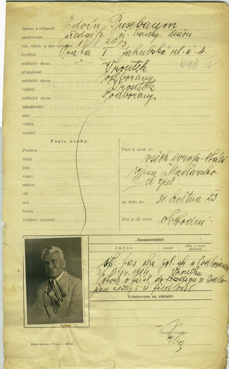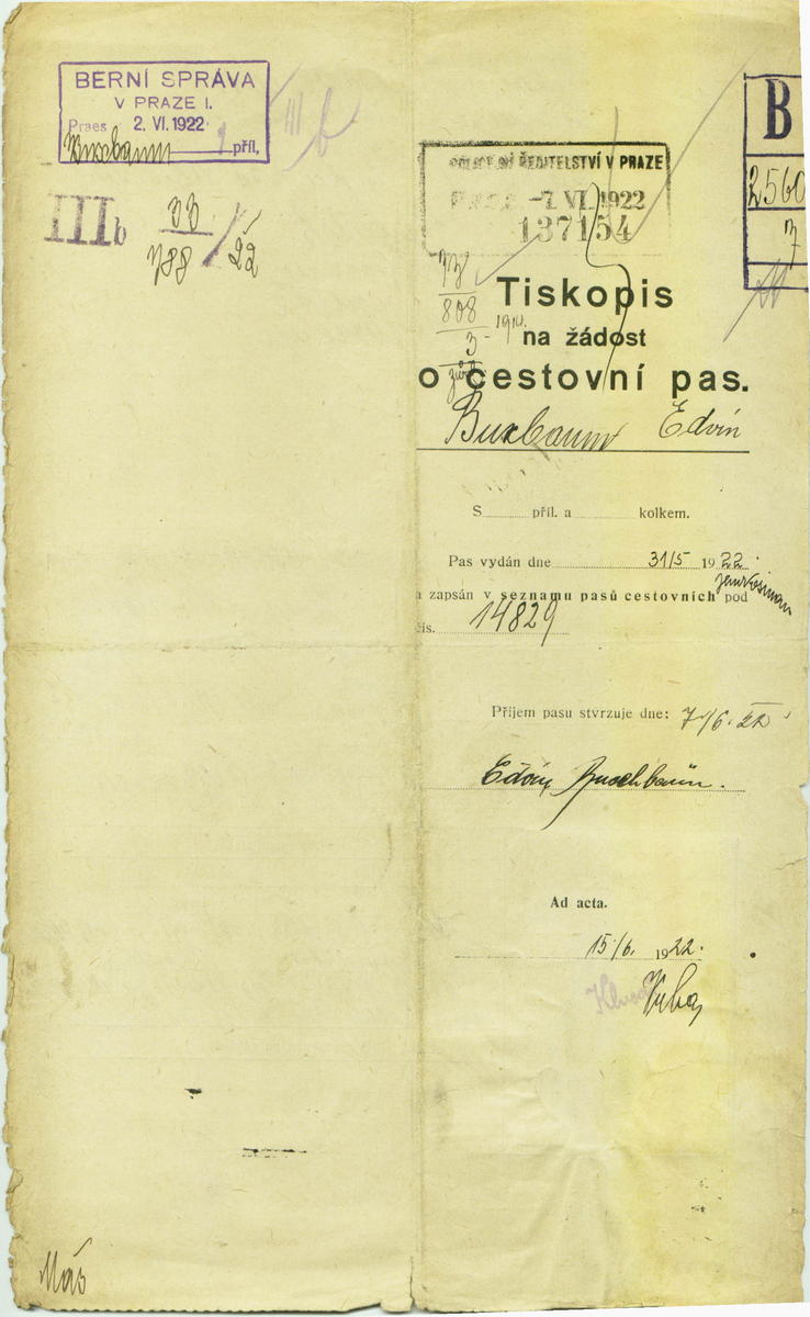 Buxbaum Edvín: Žádost o vydání cestovního pasu