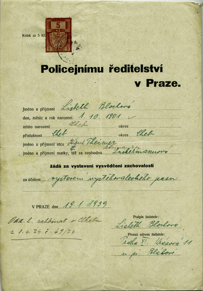 Blochová Alžběta: Žádost o vystavení vysvědčení zachovalosti