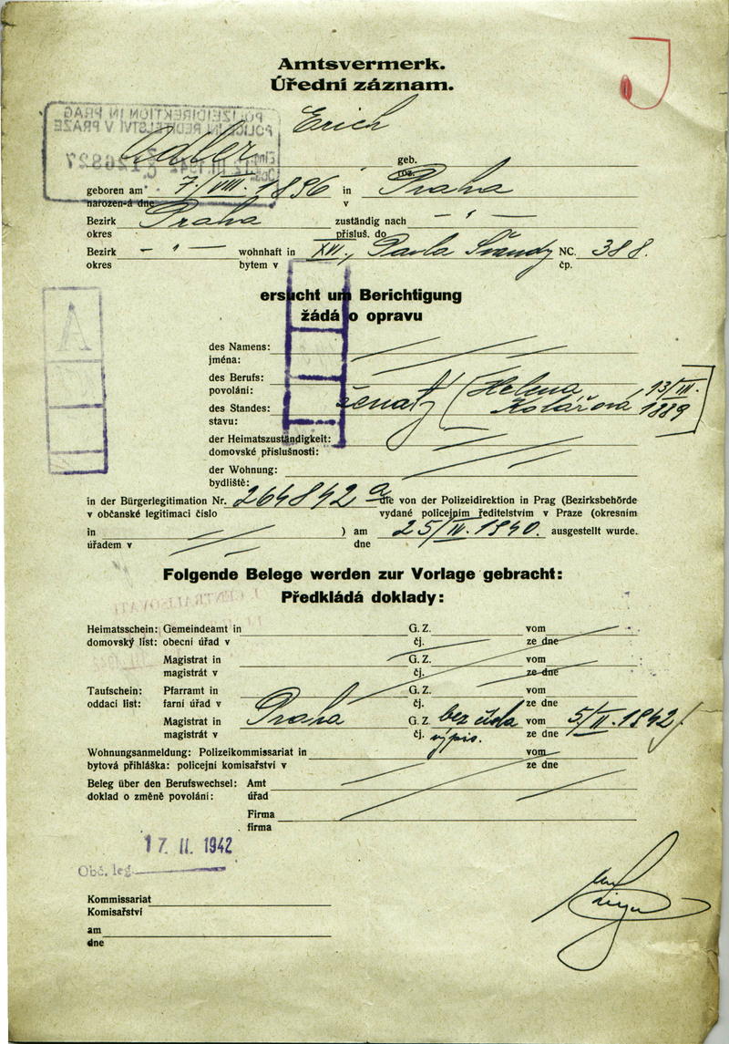 Adler Erich: Žádost o opravu v občanské legitimaci