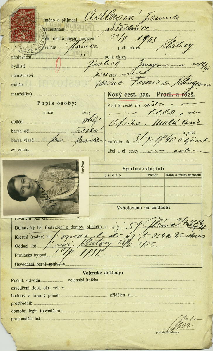 Adlerová Jarmila: Žádost o vydání cestovního pasu