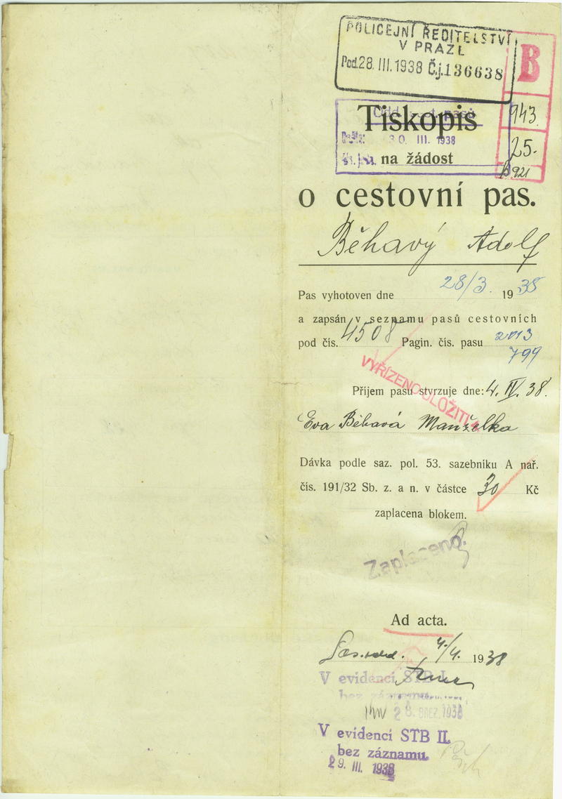 Běhavý Adolf: Žádost o vydání cestovního pasu