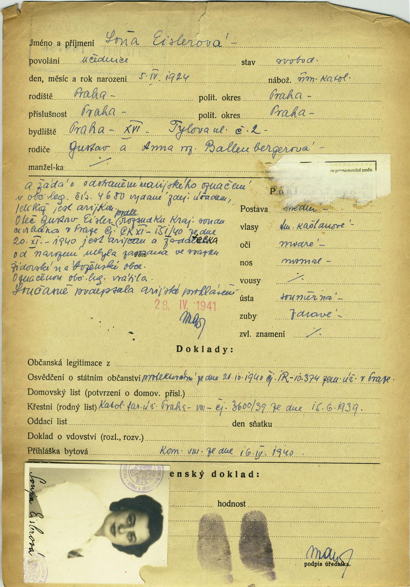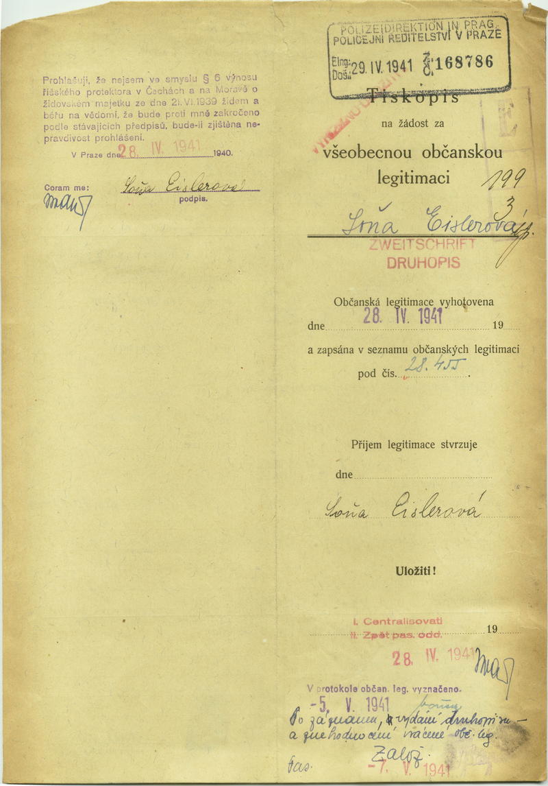 Eislerová Sonja: Žádost o vydání občanské legitimace