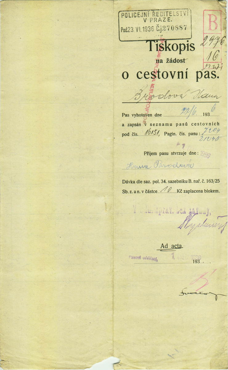 Brodová Hanna: Žádost o vydání cestovního pasu