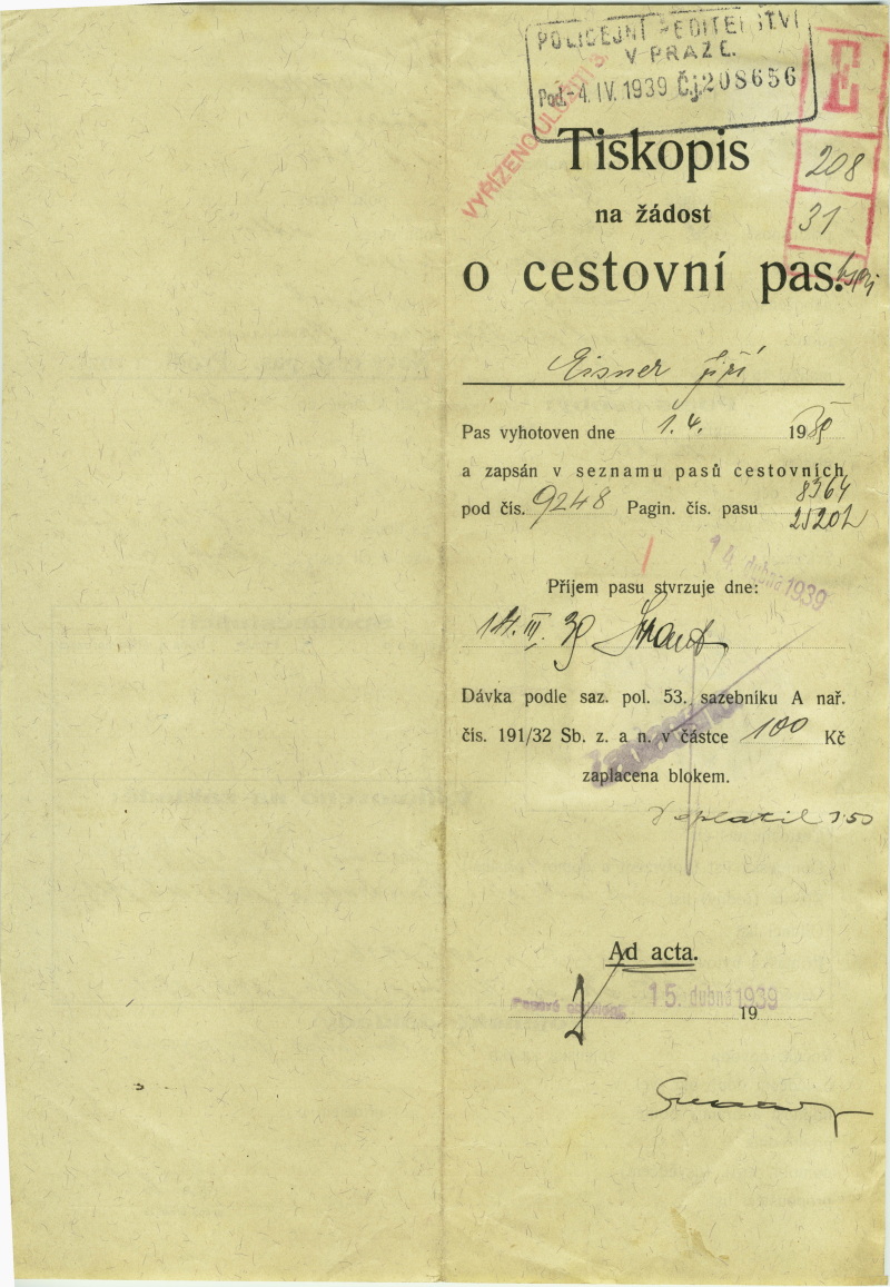 Eisner Jiří: Žádost o vydání cestovního pasu