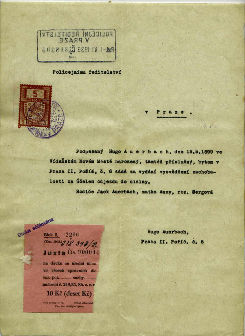 Auerbach Hugo: Žádost o vystavení vysvědčení zachovalosti