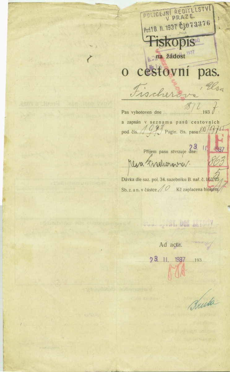 Fischerová Elsa: Žádost o vydání cestovního pasu
