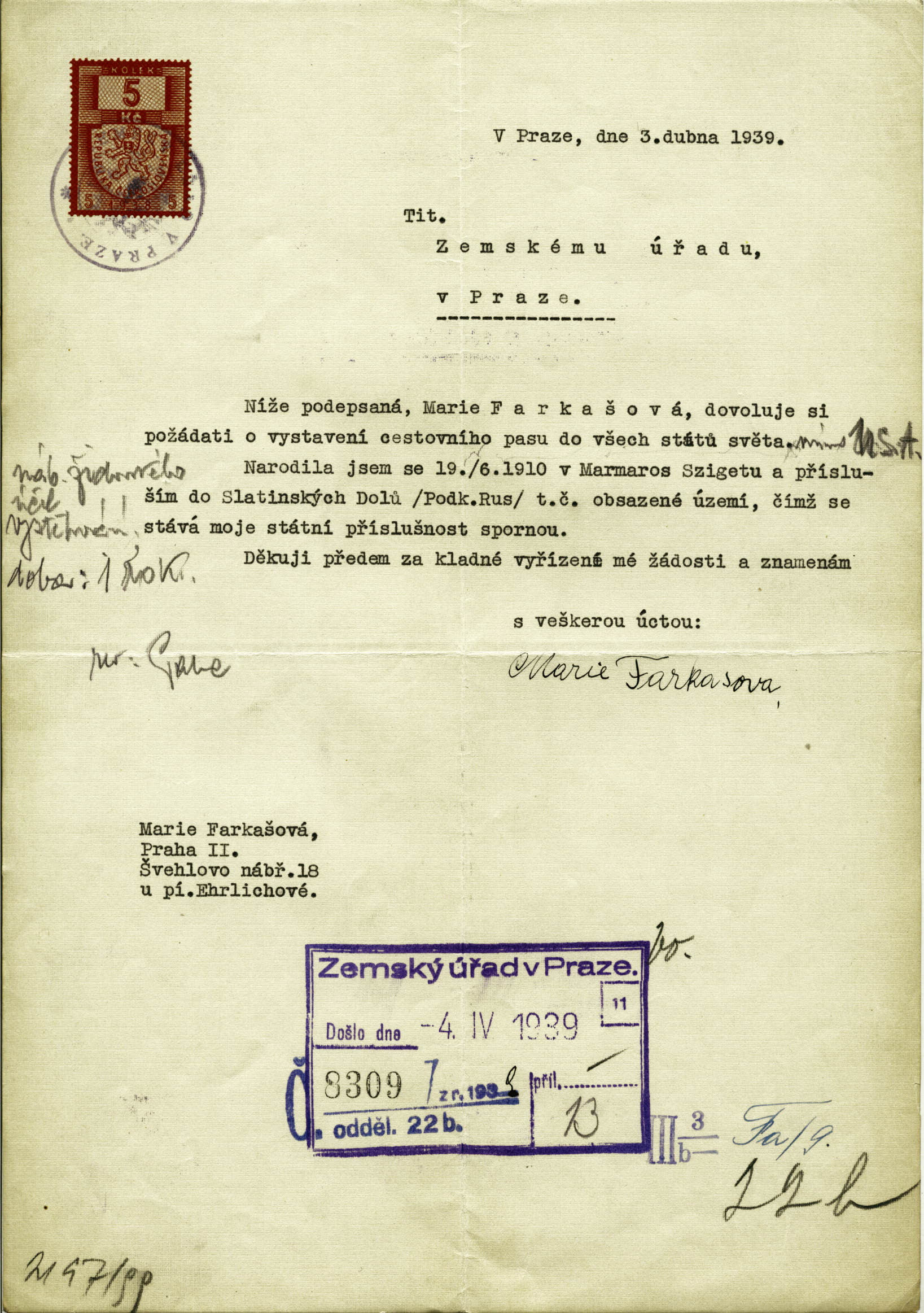 Farkašová Marie: Žádost o vydání cestovního pasu
