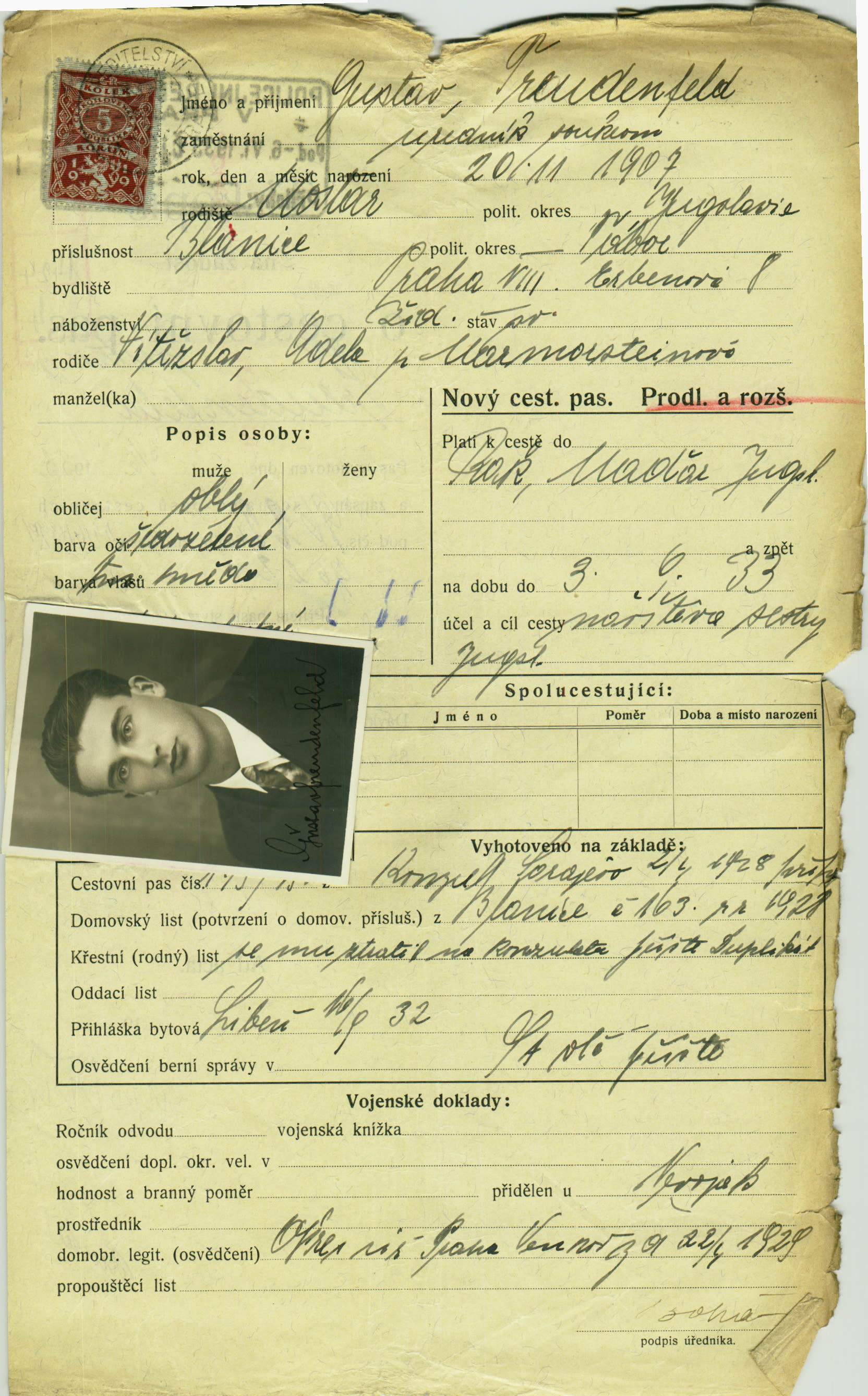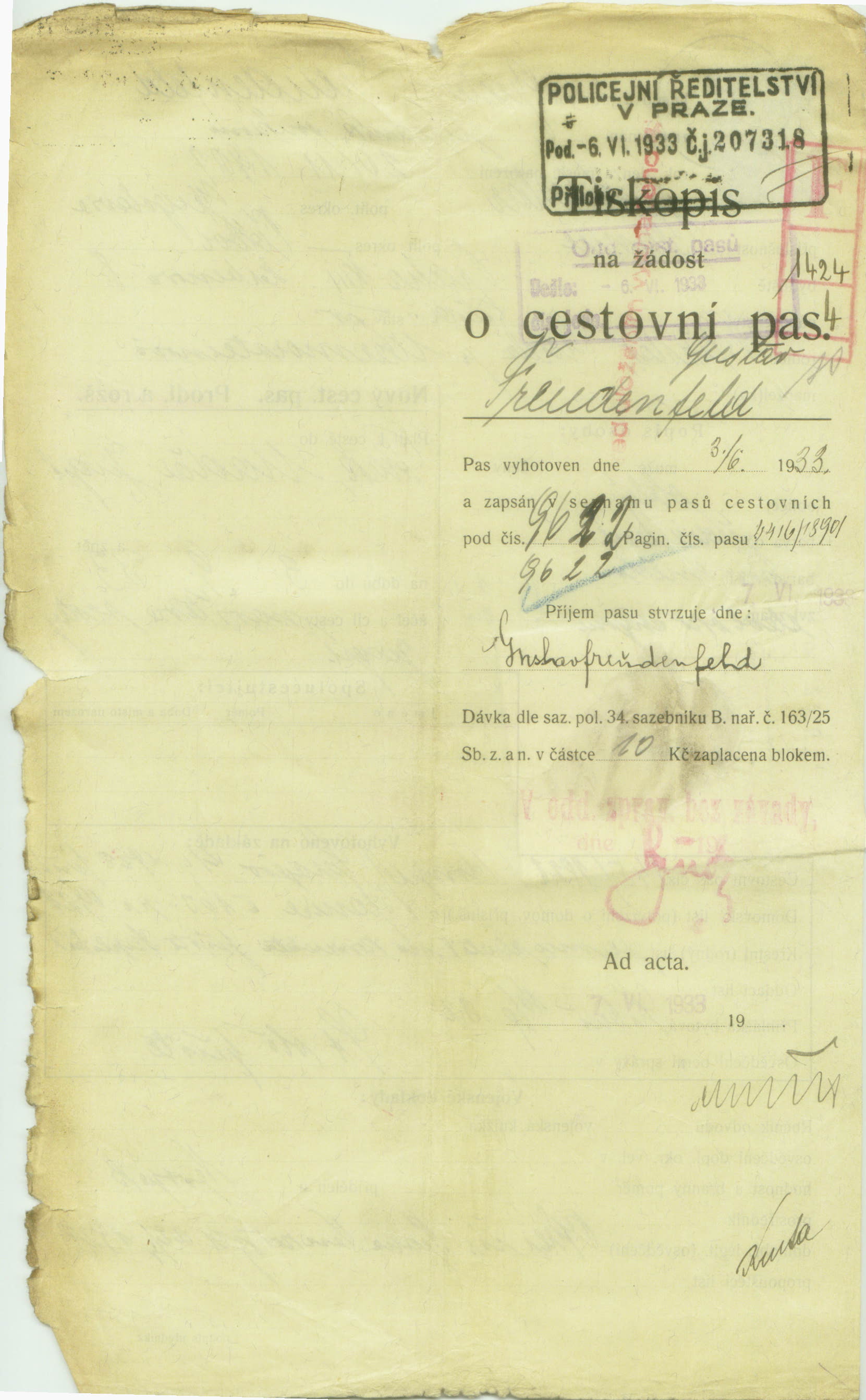 Freudenfeld Gustav: Žádost o vydání cestovního pasu