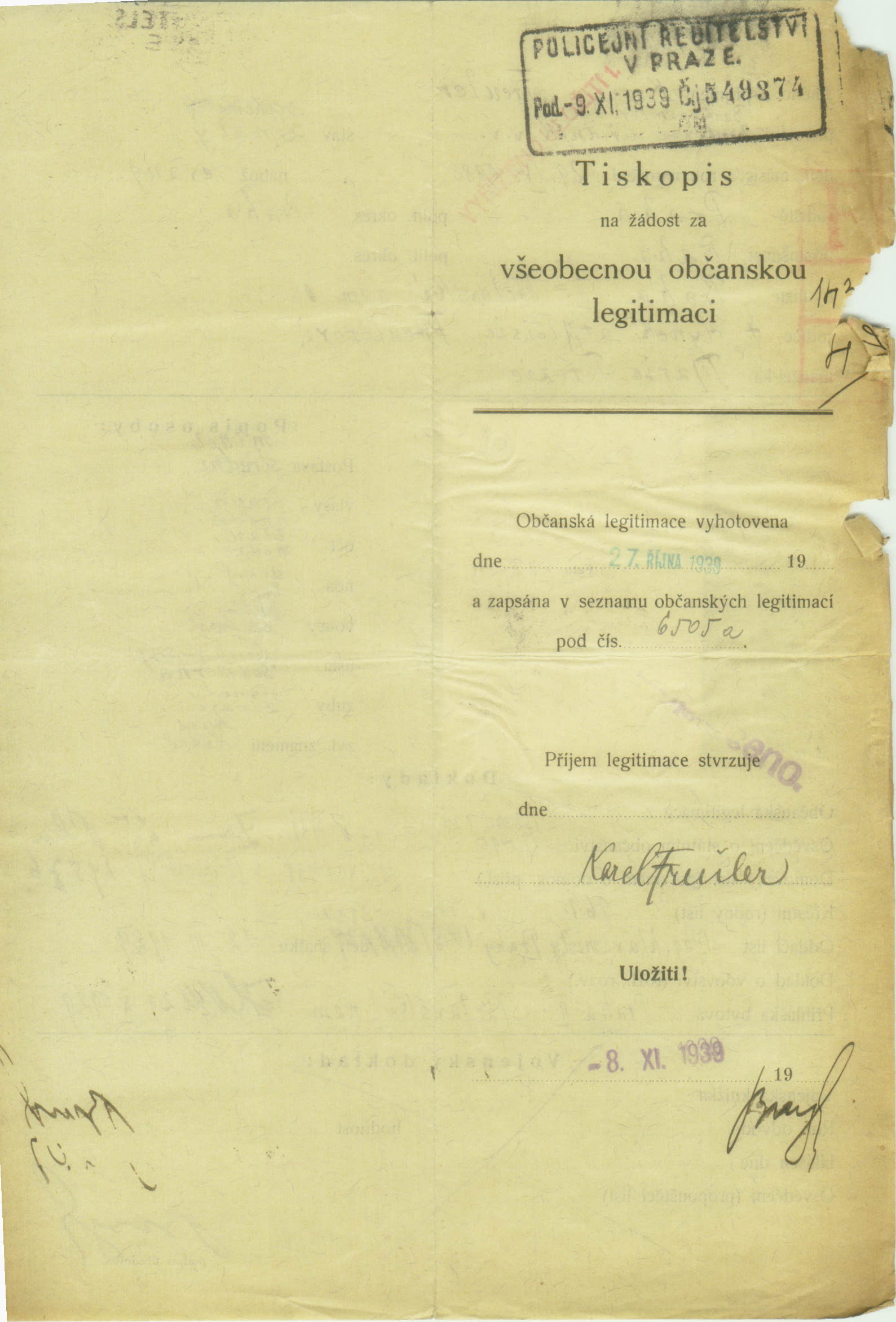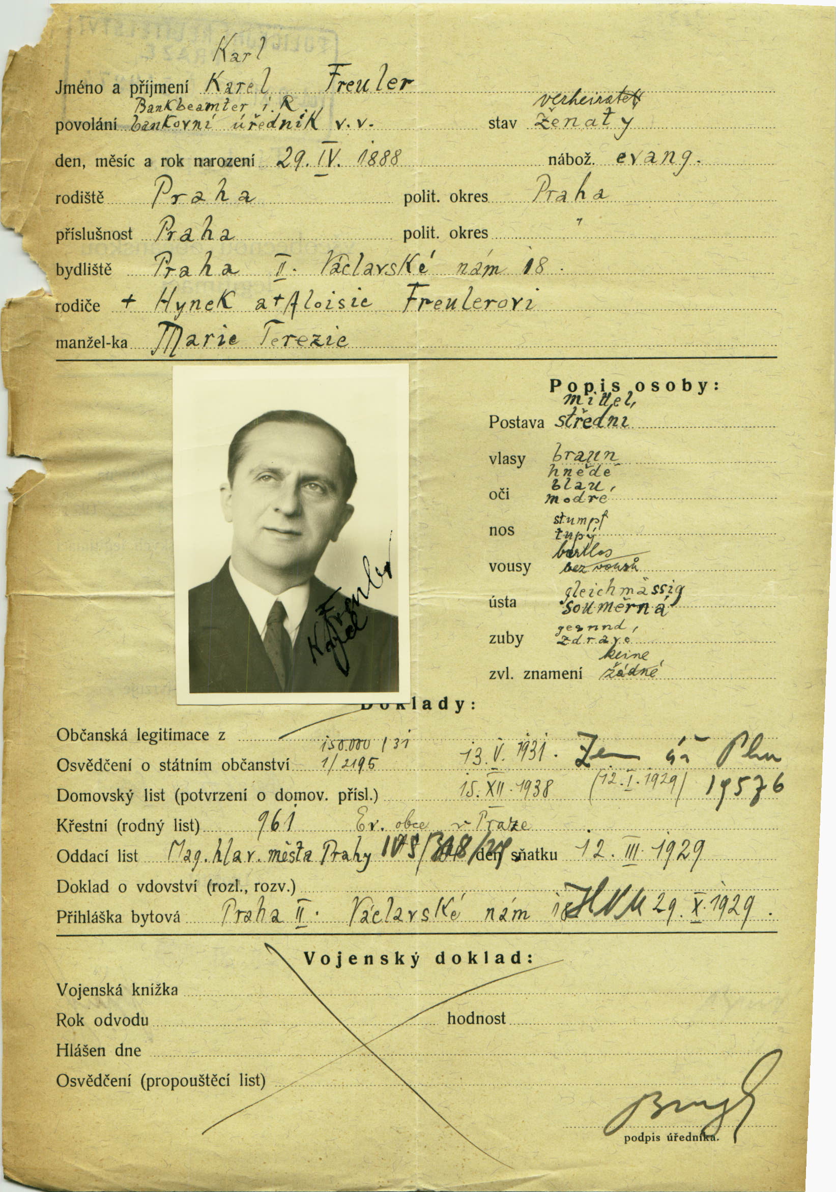 Freuler Karel: Žádost o vydání občanské legitimace