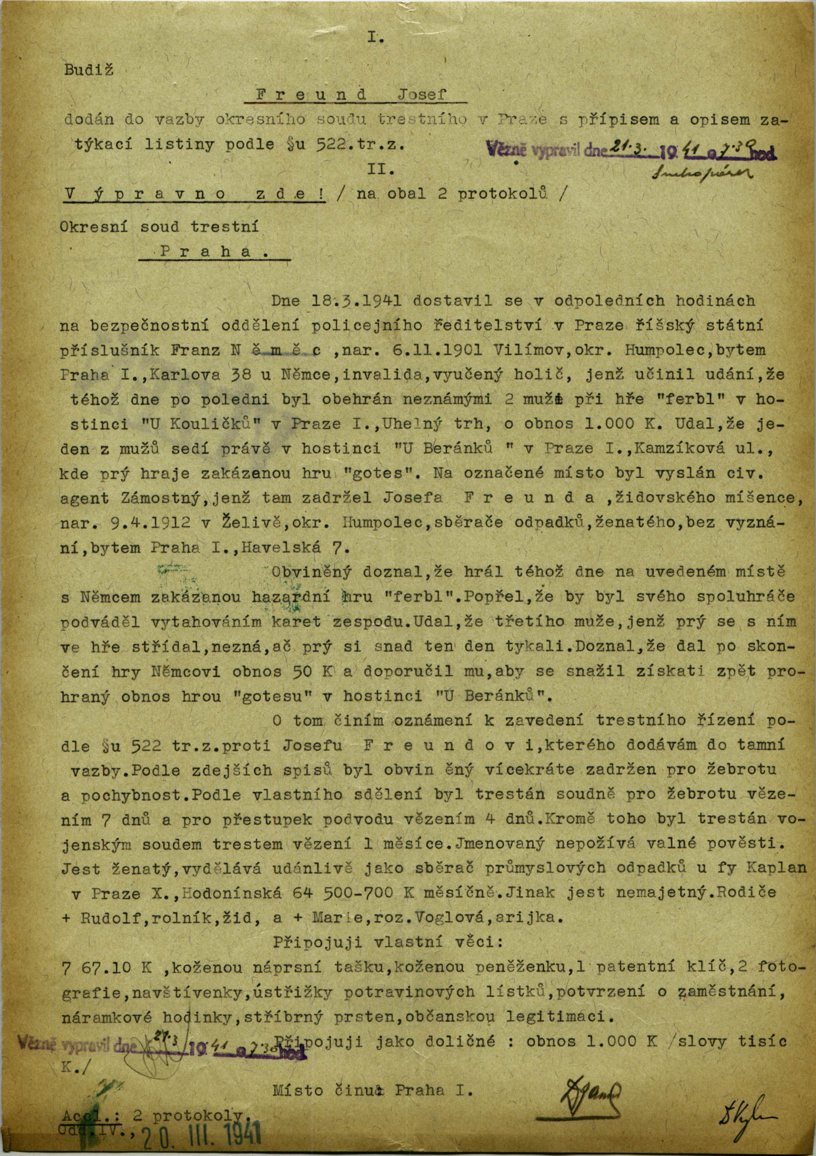 Národní archiv Praha > Policejní ředitelství v Praze > 1941-1950 > F > Freund Josef