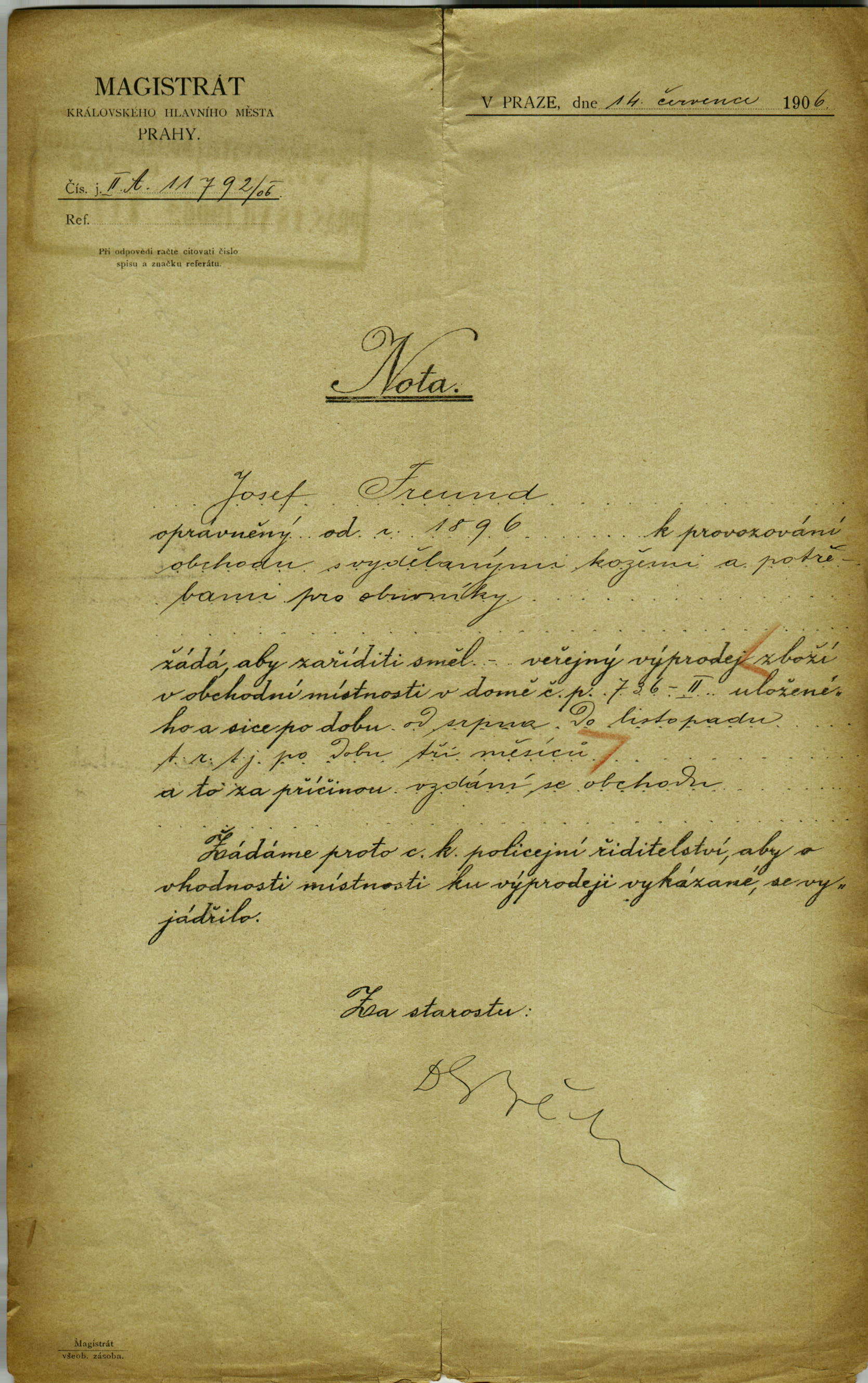 Freund Josef: Žádost o povolení výprodeje