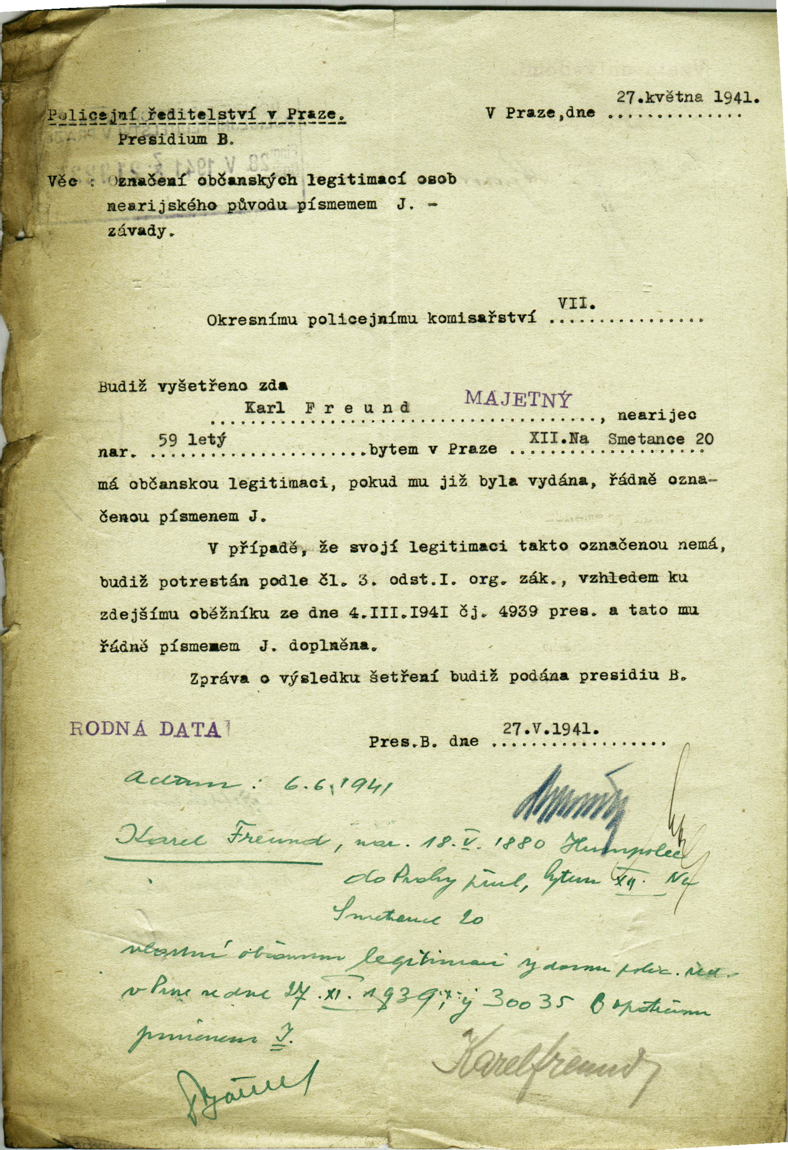 Freund Karel: Označení občanských legitimací písmenem J