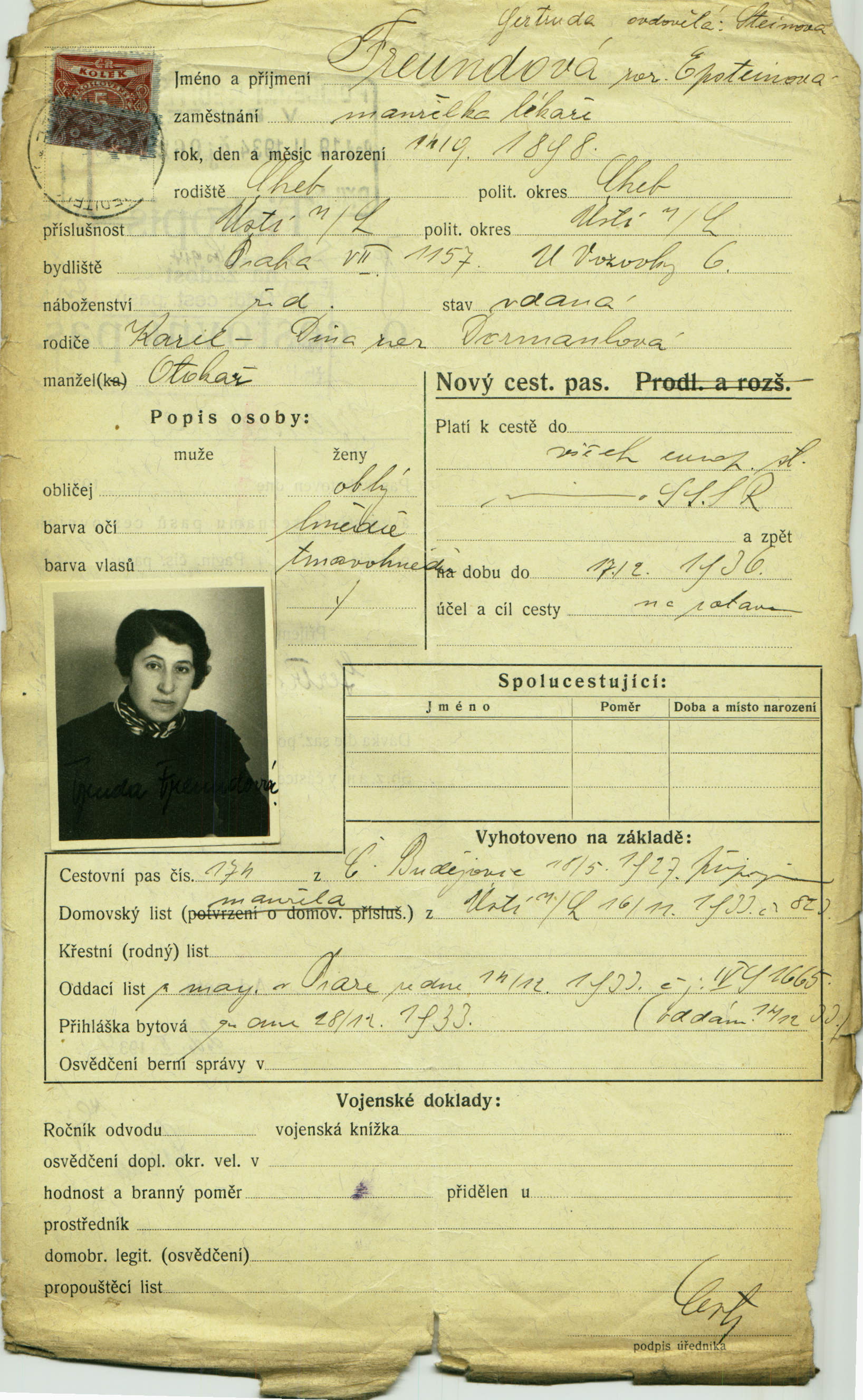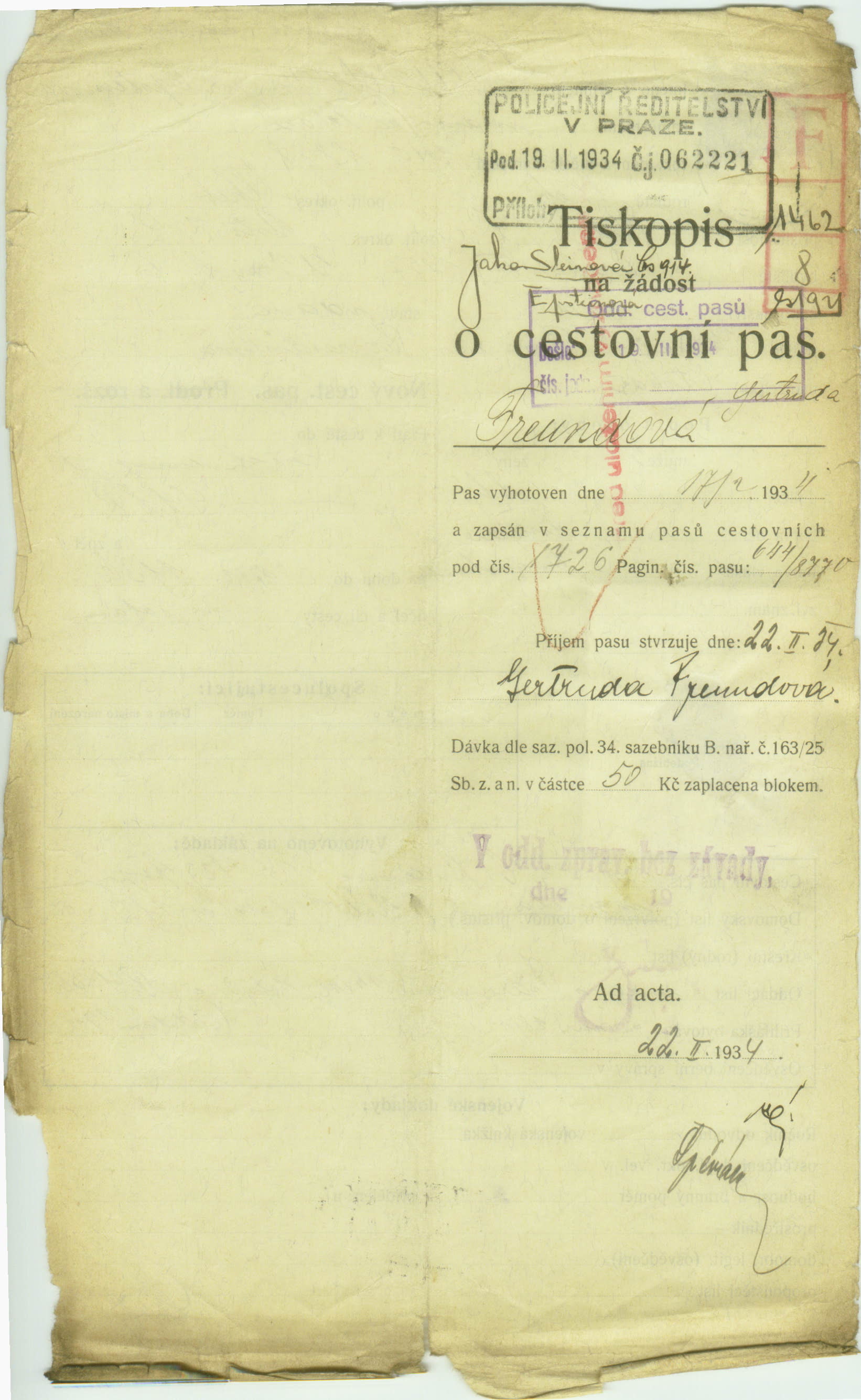 Freundová Gertruda: Žádost o vydání cestovního pasu