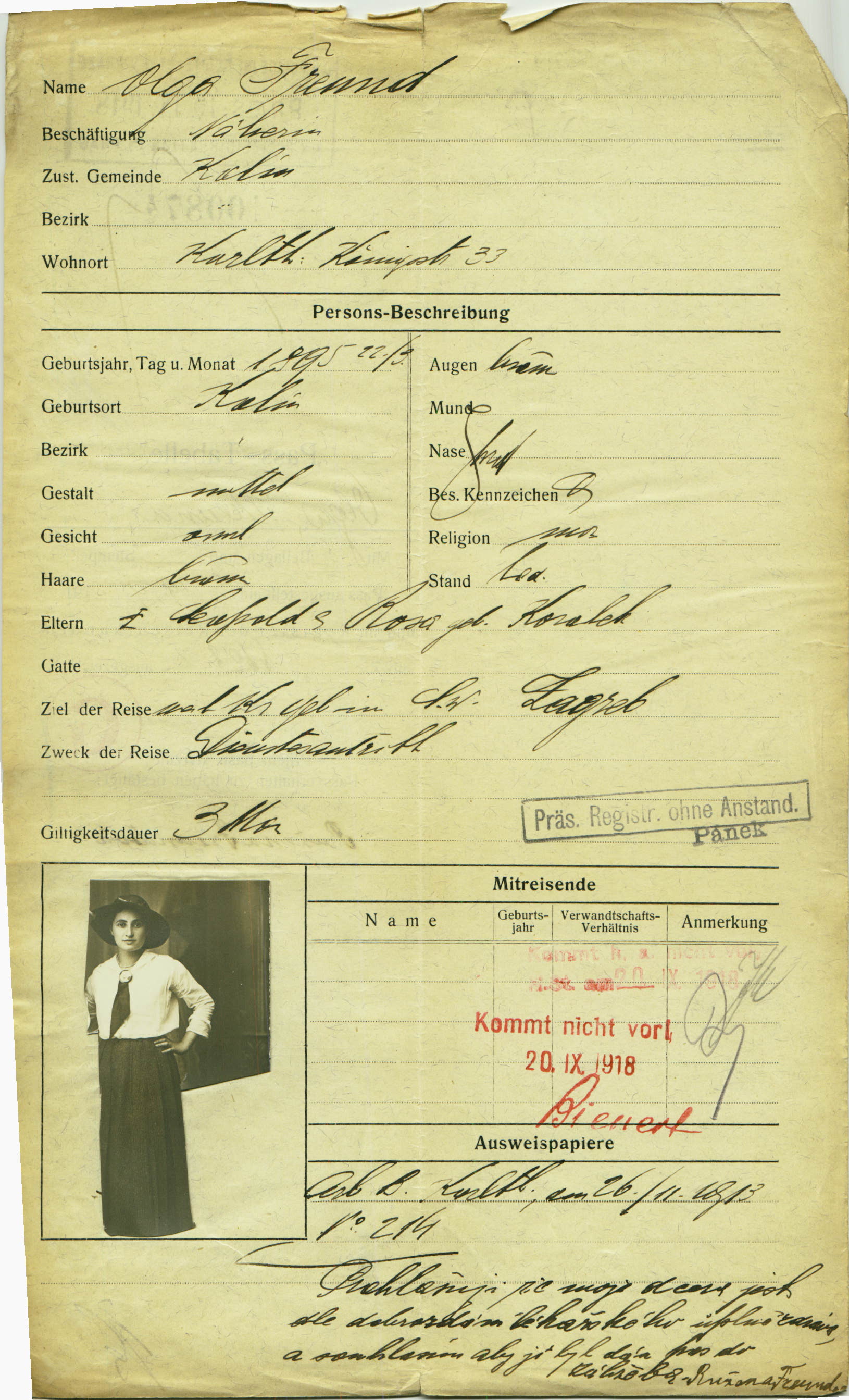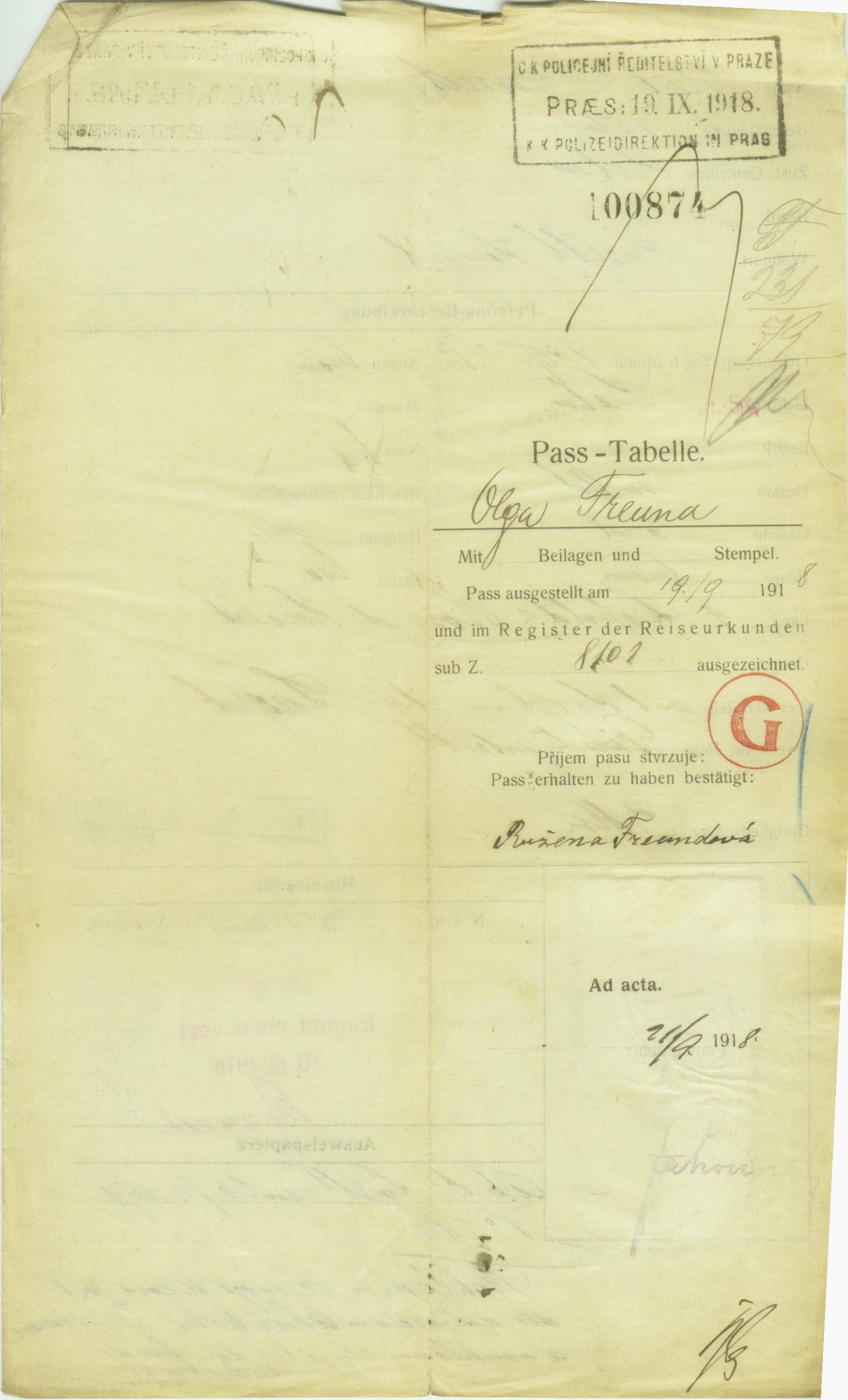 Freundová Olga: Žádost o vydání cestovního pasu