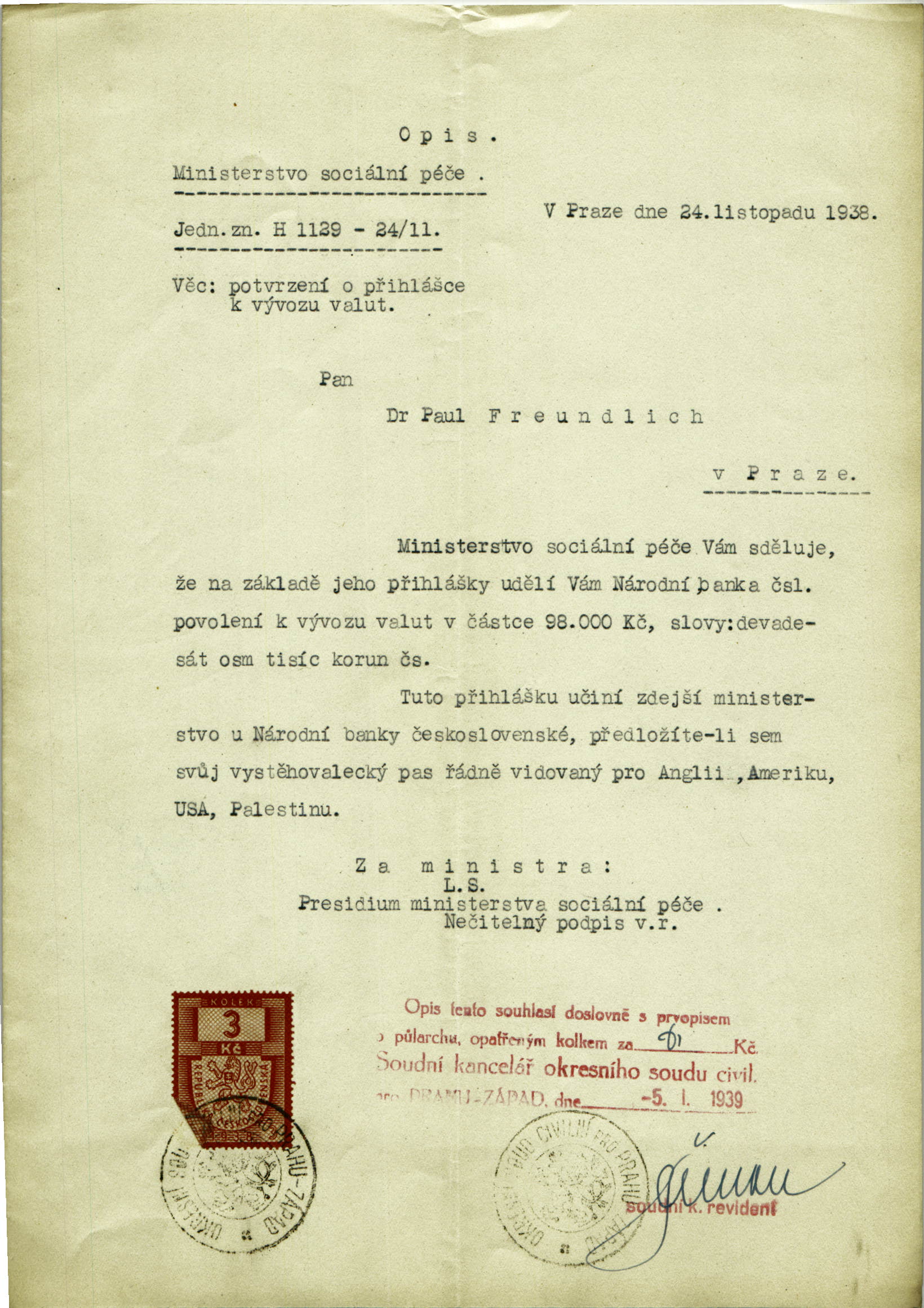 Freundlich Pavel: Potvrzení o přihlášce k vývozu valut