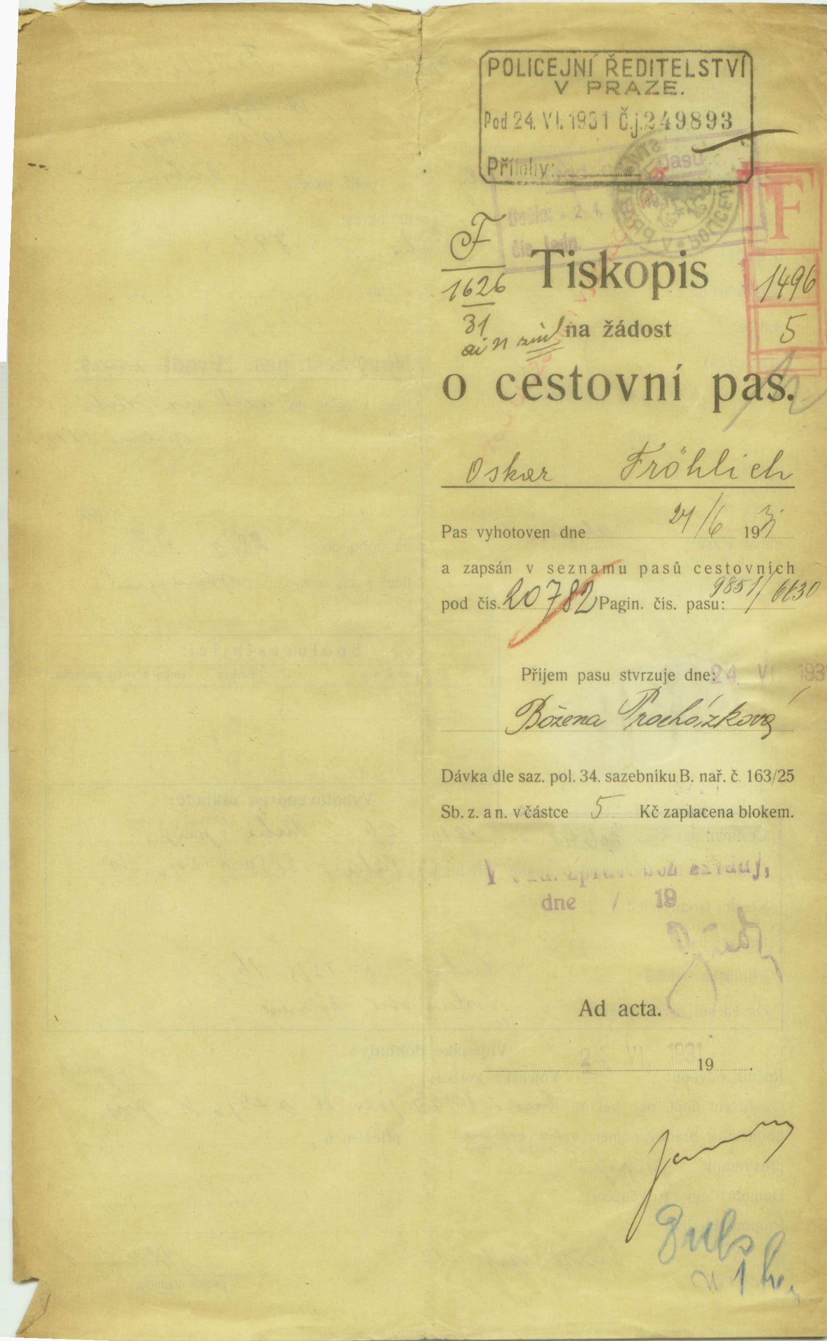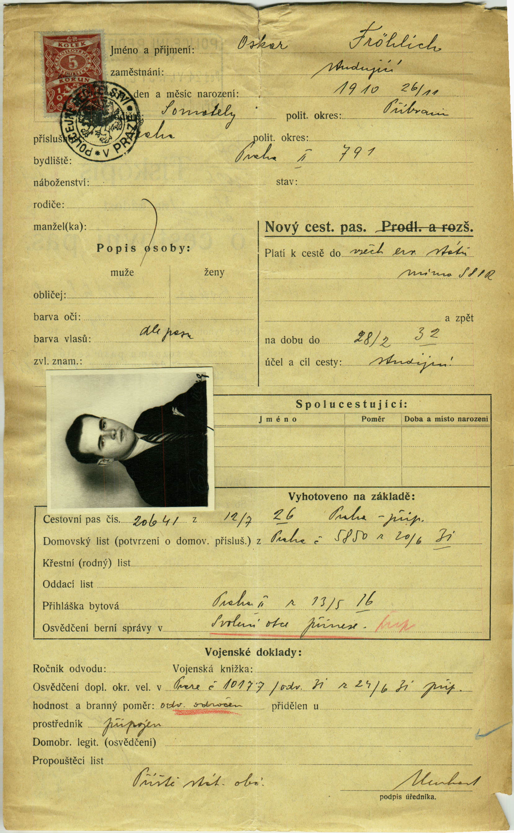 Fröhlich Oskar: Žádost o vydání cestovního pasu