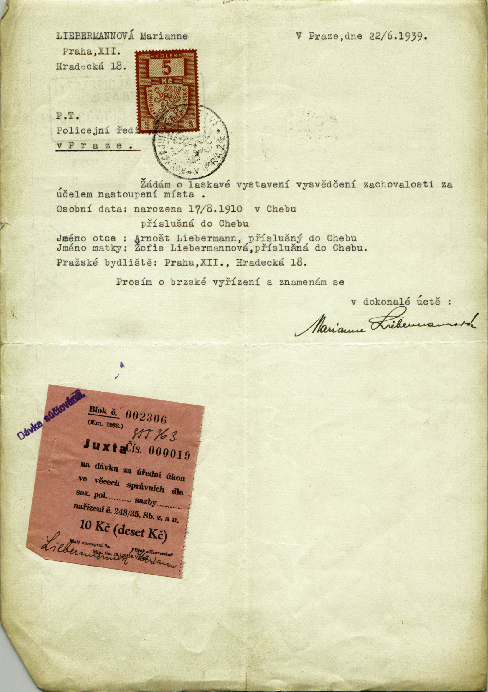 Friedová Marianna: Žádost o vystavení vysvědčení zachovalosti