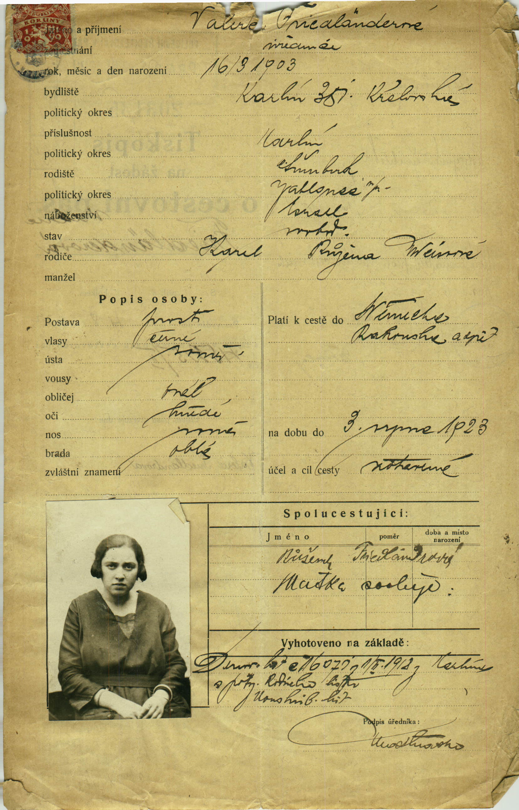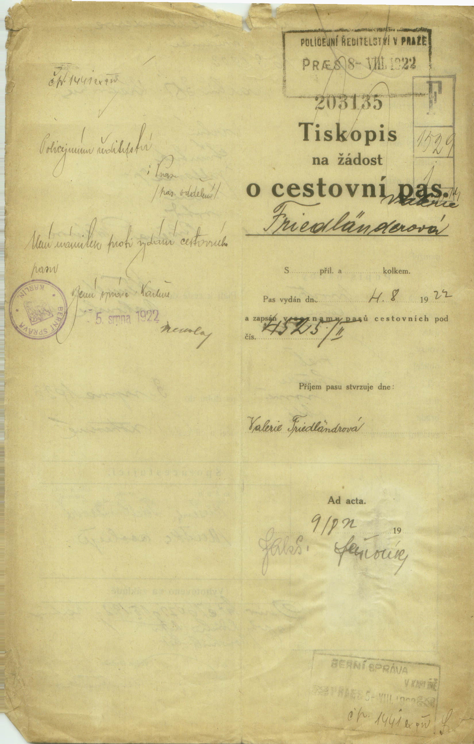 Friedländerová Valerie: Žádost o vydání cestovního pasu
