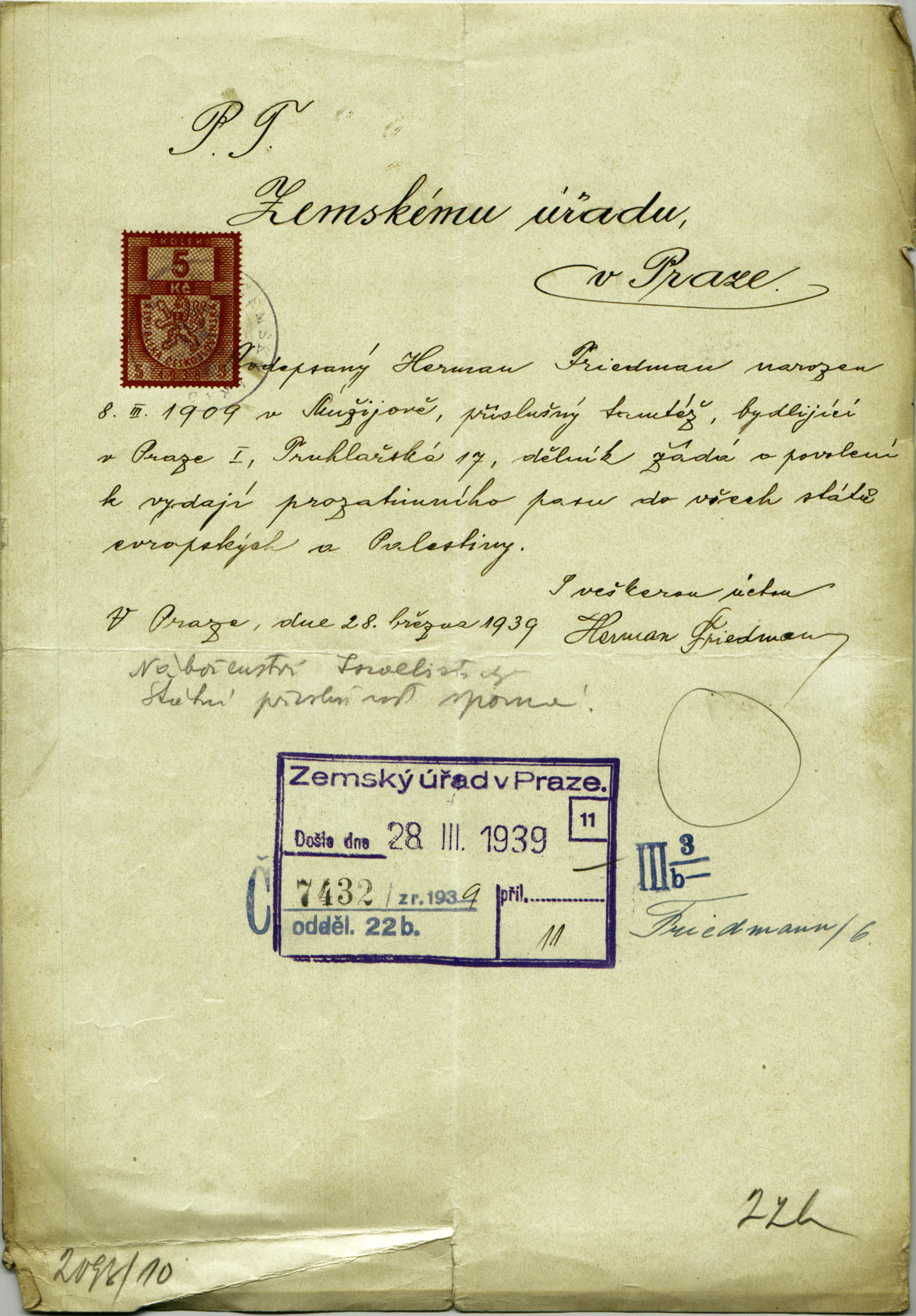 Friedmann Heřman: Žádost o vydání prozatímního cestovního pasu