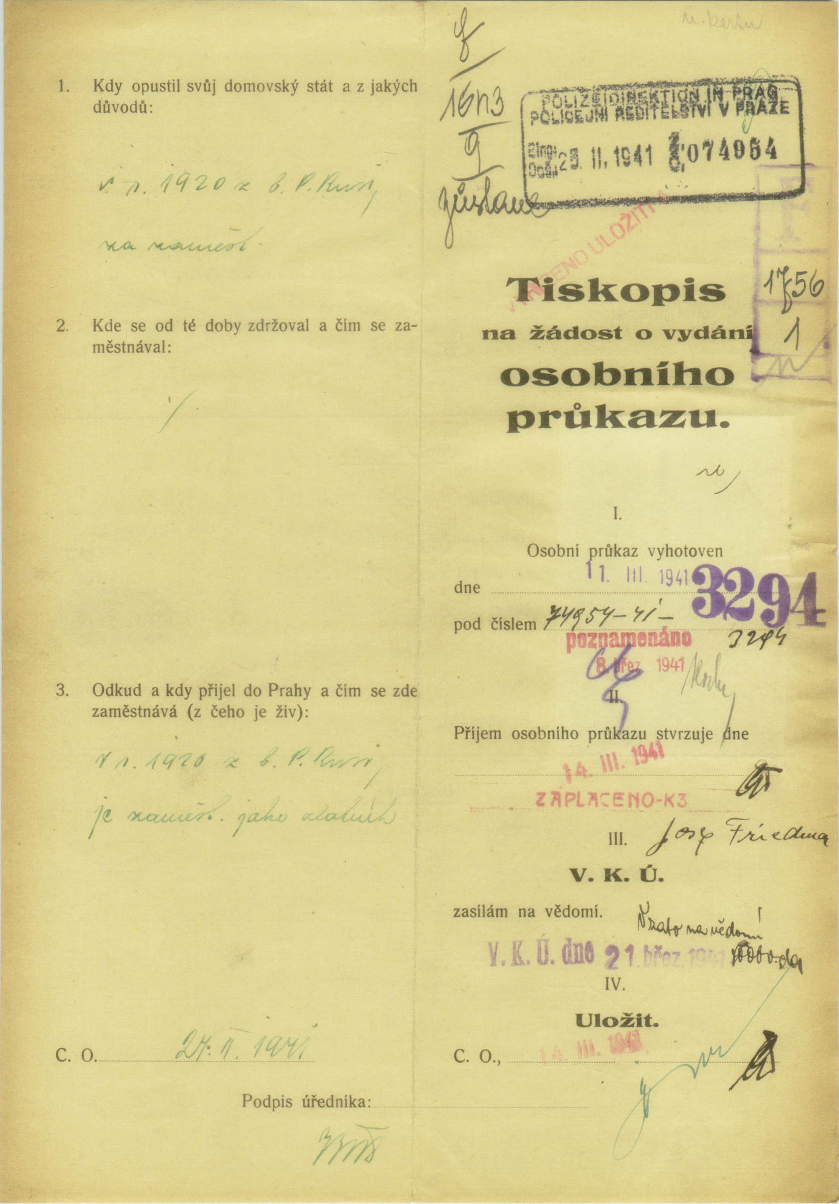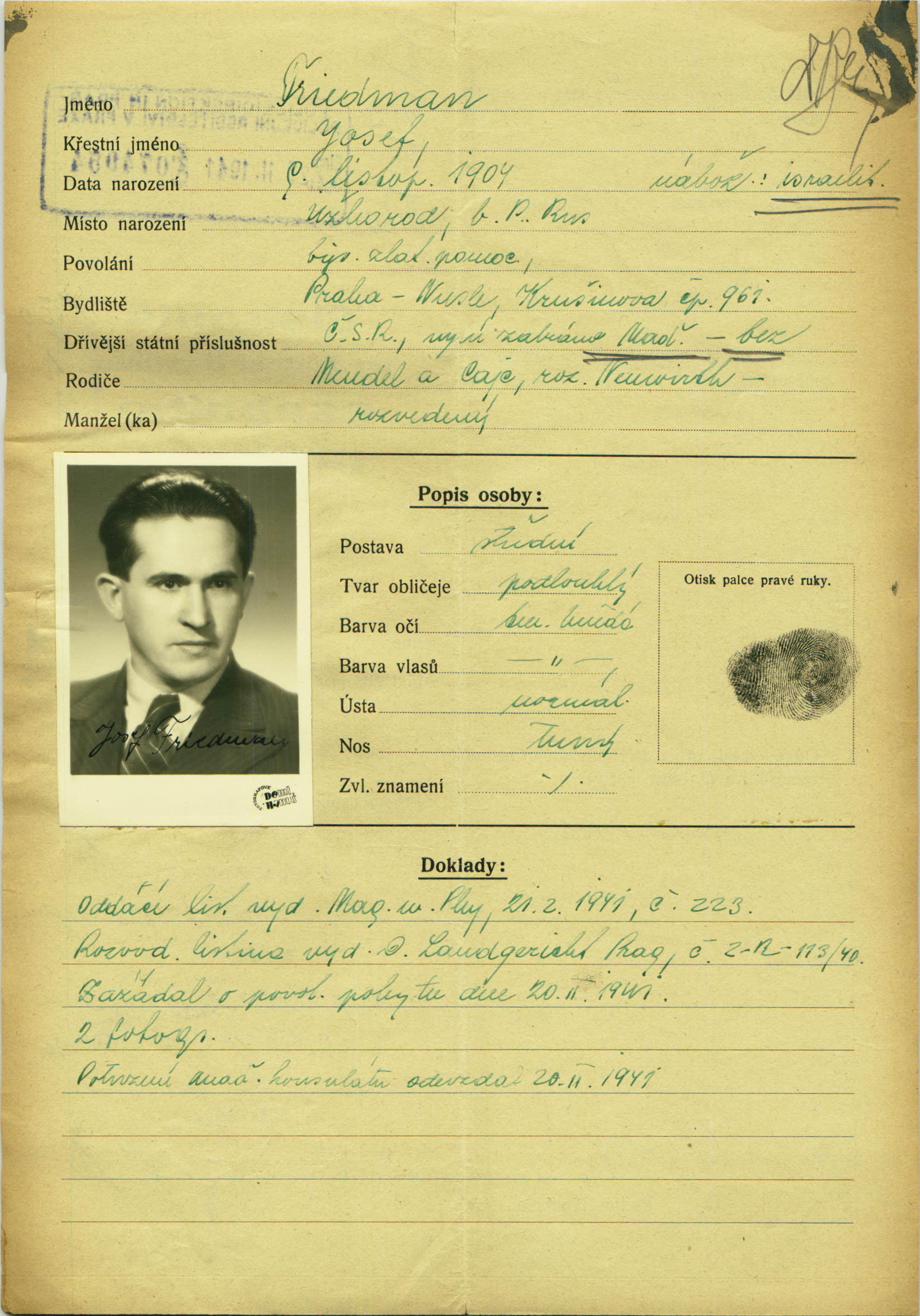 Friedmann Josef: Žádost o vydání občanské legitimace