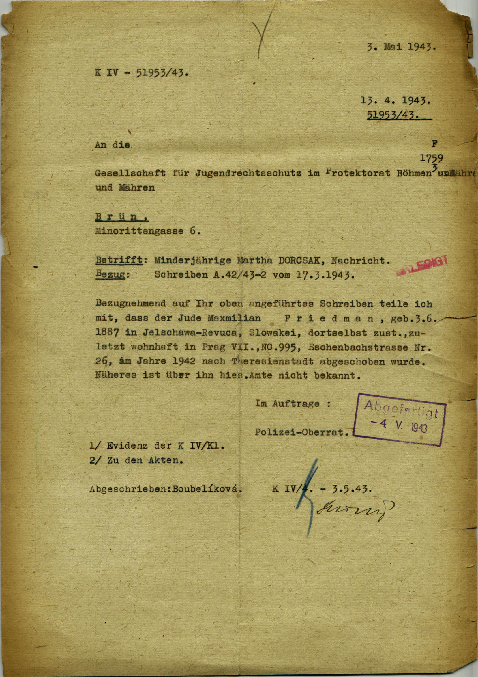 Friedmann Max: Šetření o pobytu odtransportovaných Židů