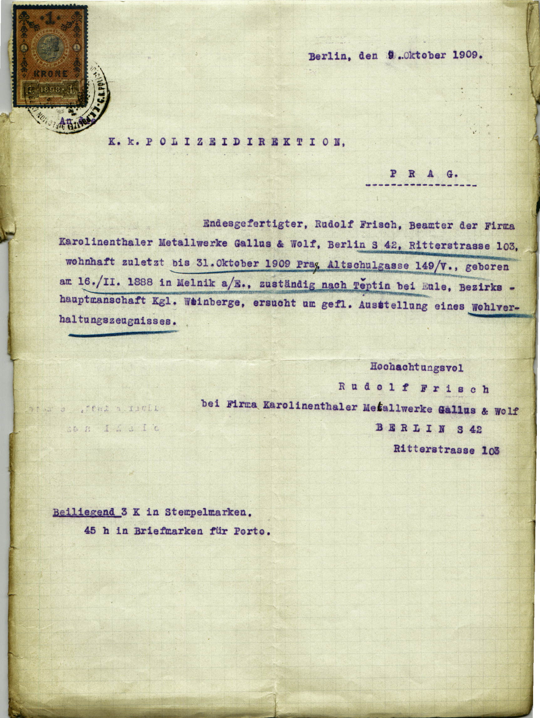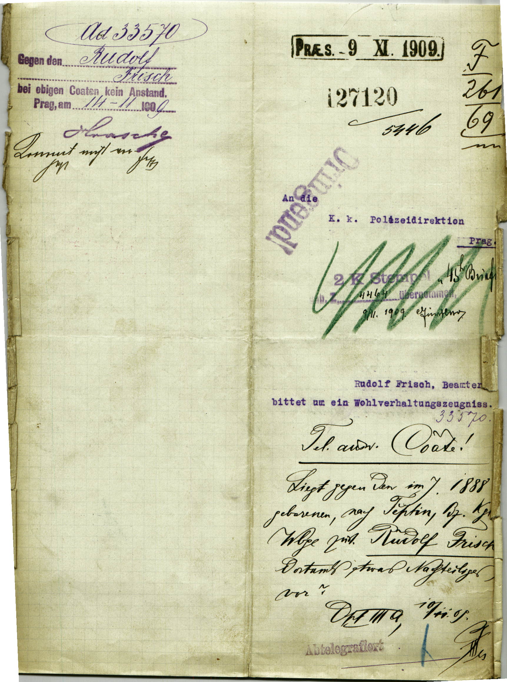 Frisch Rudolf: Žádost o vystavení vysvědčení zachovalosti