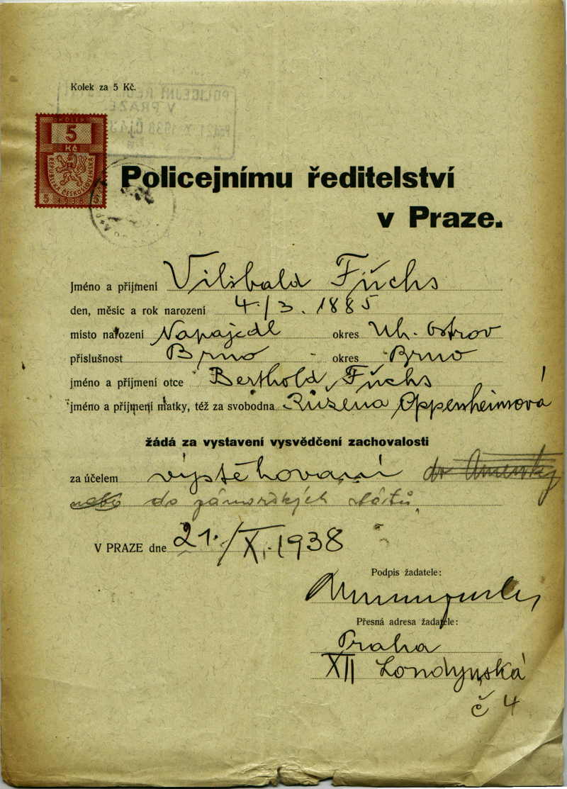 Fuchs Vilibald: Žádost o vystavení vysvědčení zachovalosti