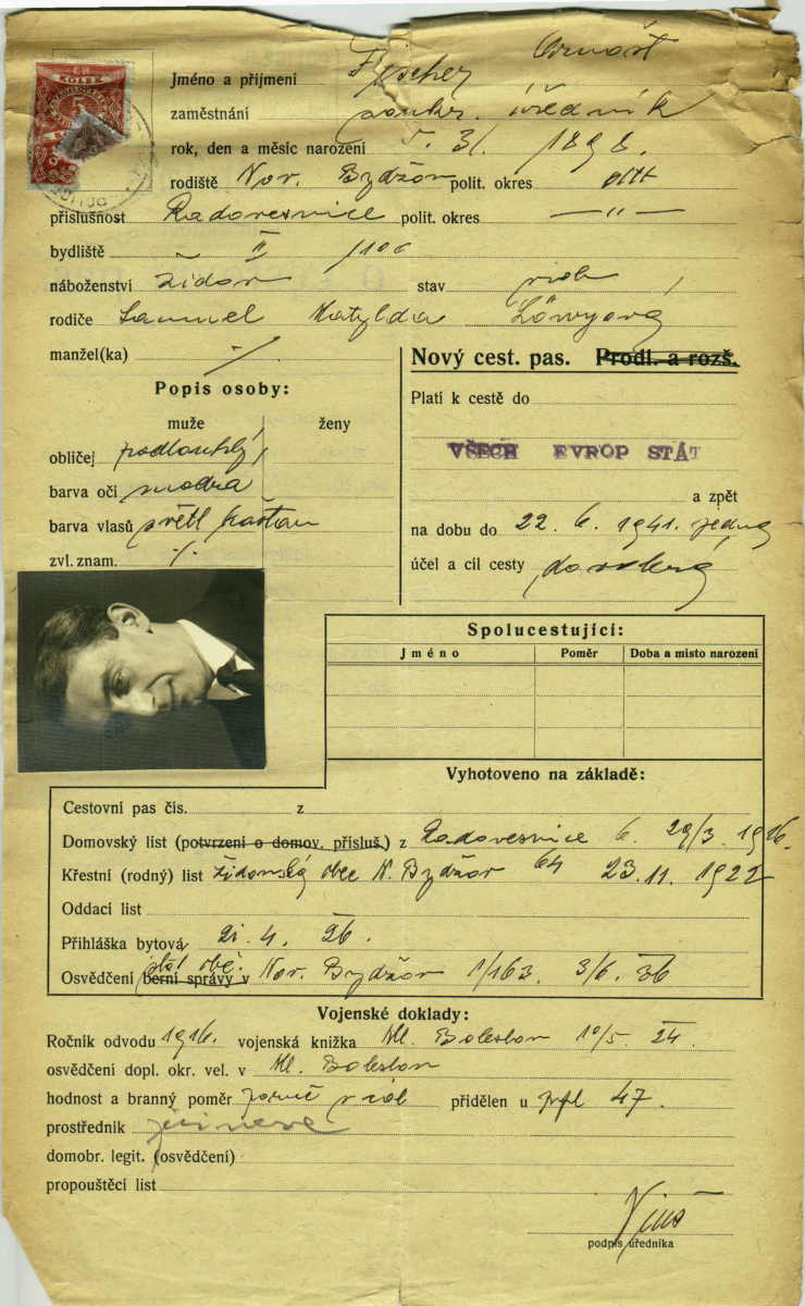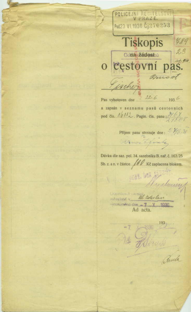 Fischer Arnošt: Žádost o vydání cestovního pasu