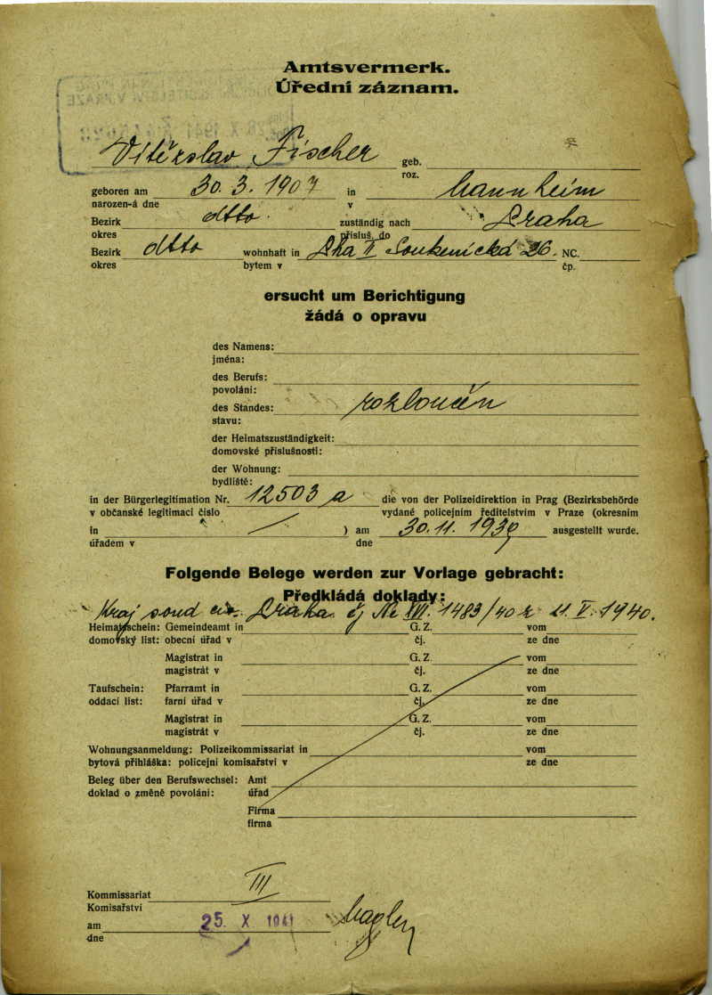 Fischer Vítězslav: Žádost o opravu v občanské legitimaci