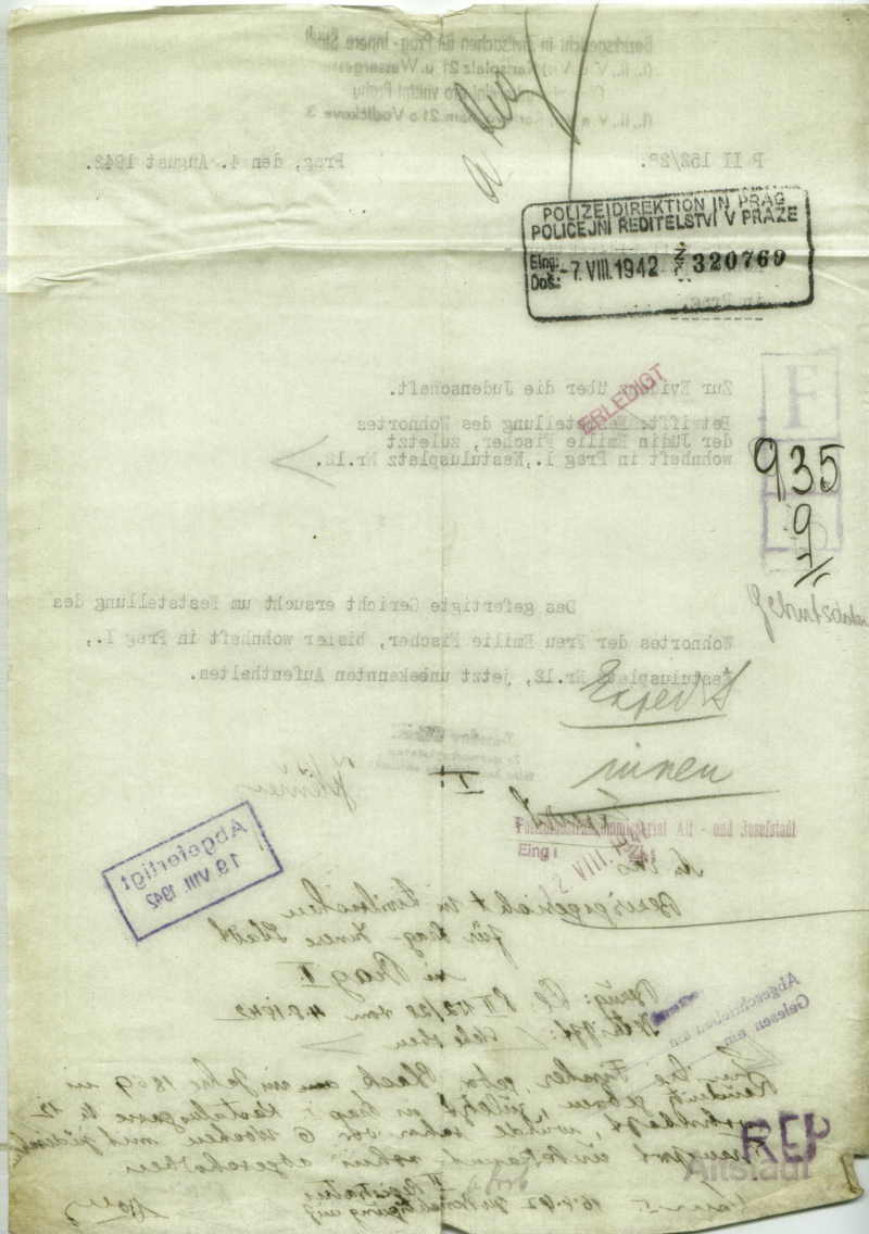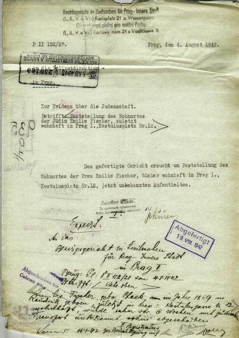 Fischerová Emilie: Šetření o pobytu odtransportovaných Židů