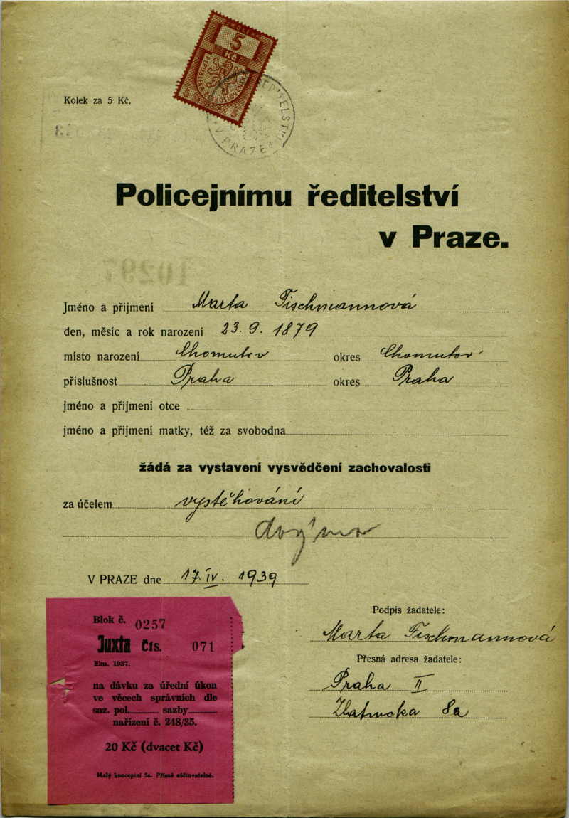 Fischmannová Marta: Žádost o vystavení vysvědčení zachovalosti