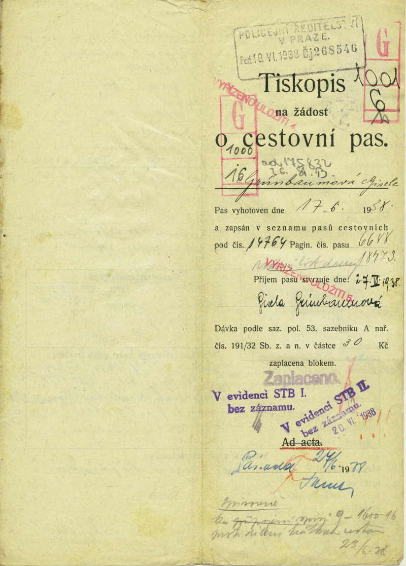 Grünbaumová Gisela: Žádost o vydání cestovního pasu