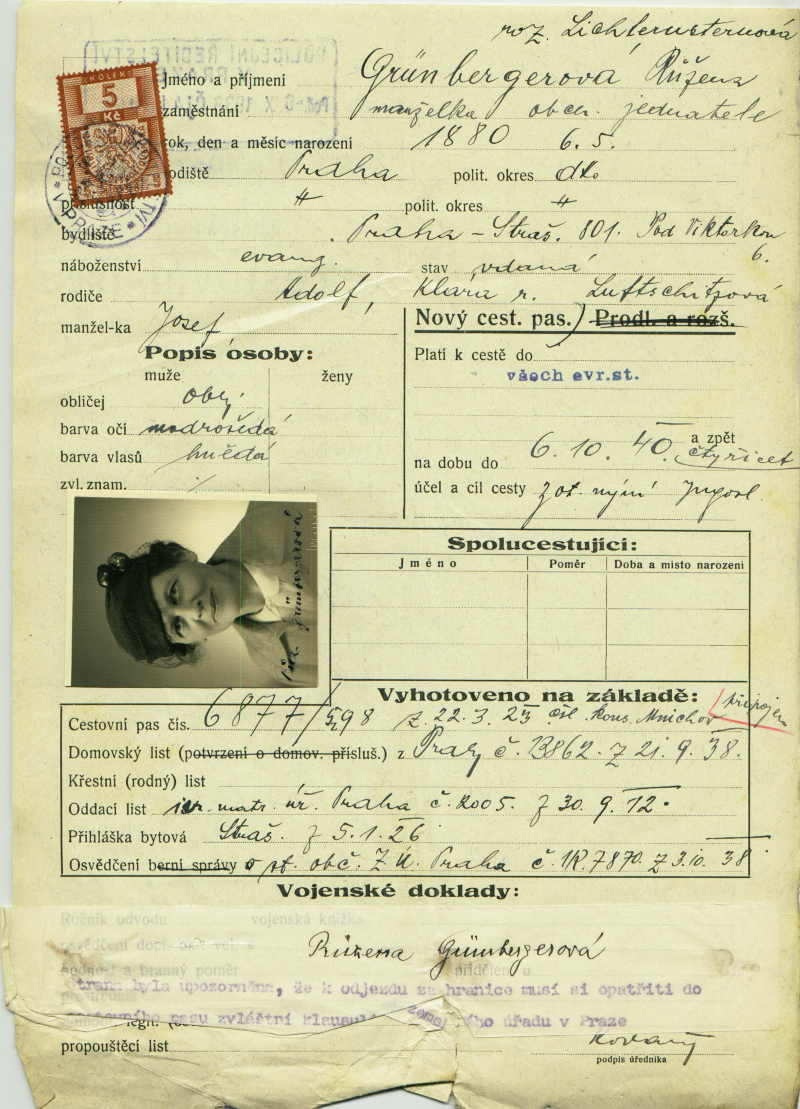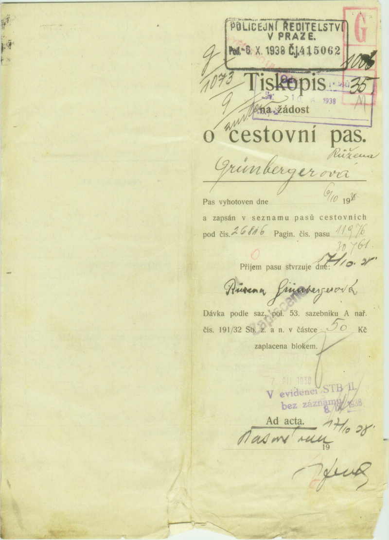 Grünbergerová Růžena: Žádost o vydání cestovního pasu