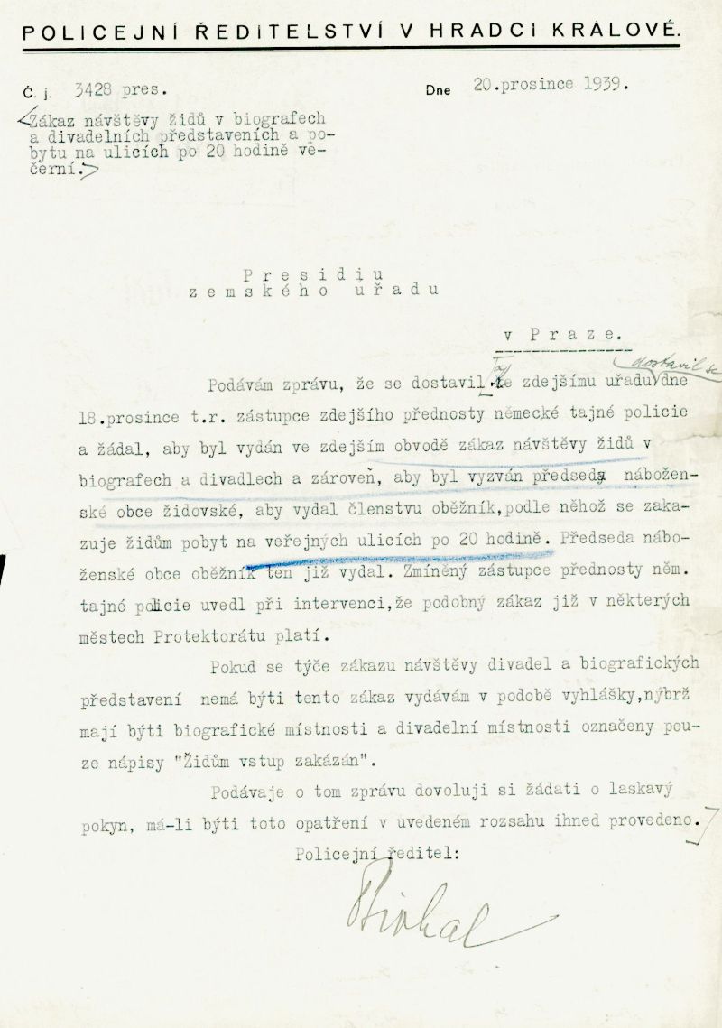 Zpráva o pokynu k vydání zákazu návštěvy kin, divadel a vycházení po 20. hodině v Hradci Králové
