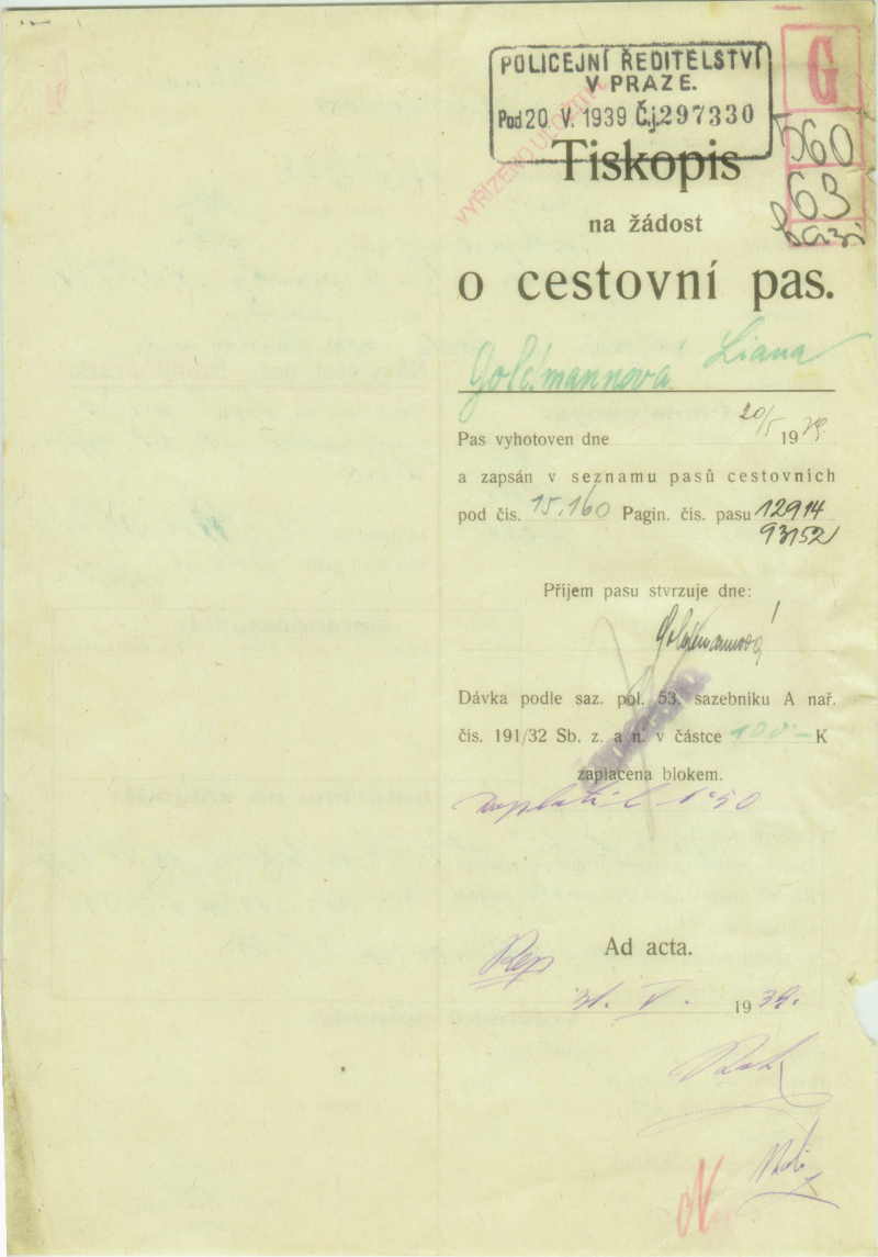 Goldmannová Liana: Žádost o vydání cestovního pasu