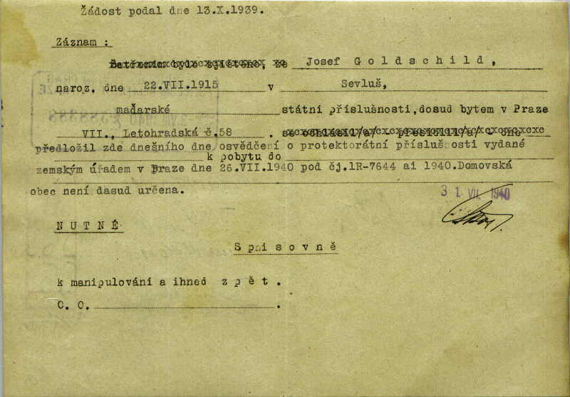 Goldschild Josef: Potvrzení o předložení osvědčení o státní příslušnosti