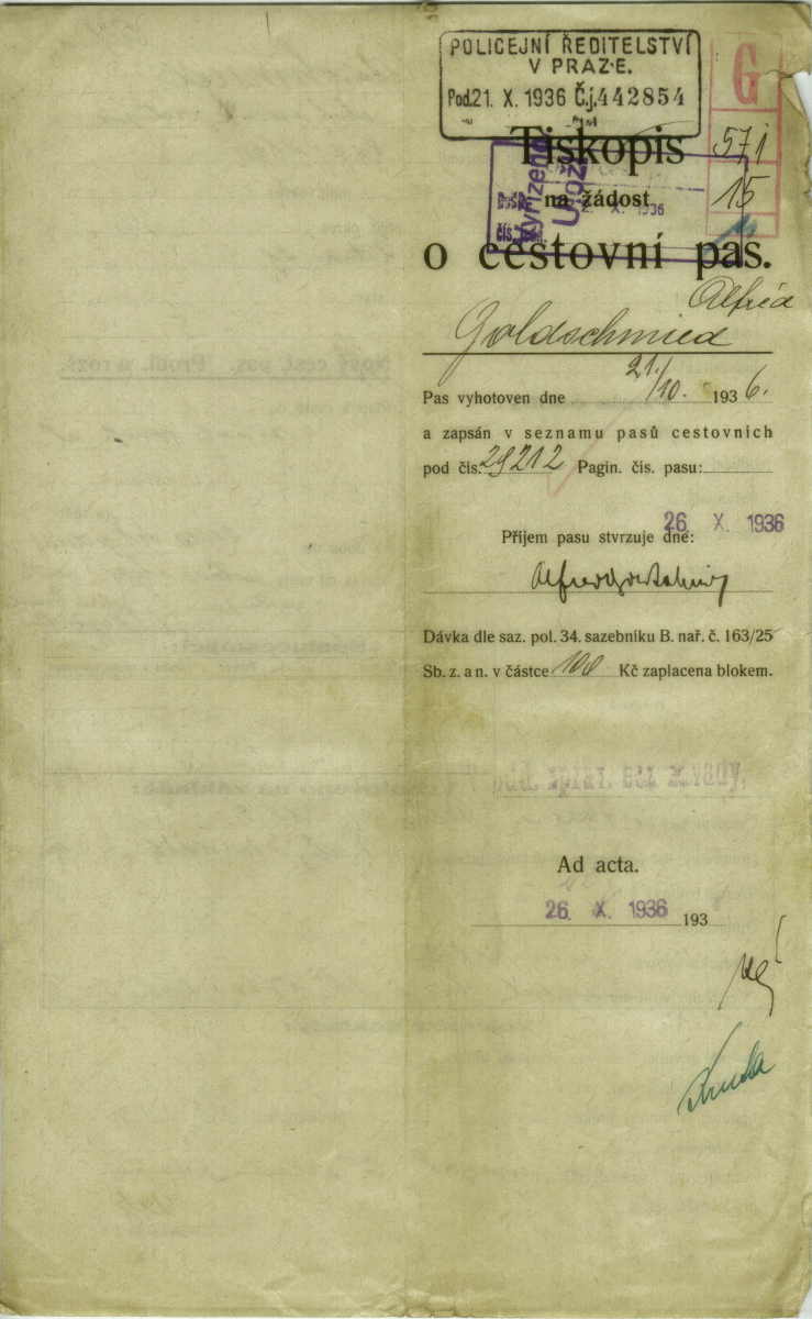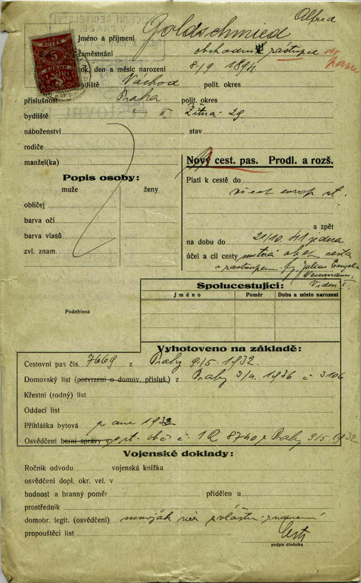 Goldschmid Alfred: Žádost o změnu v cestovním pasu