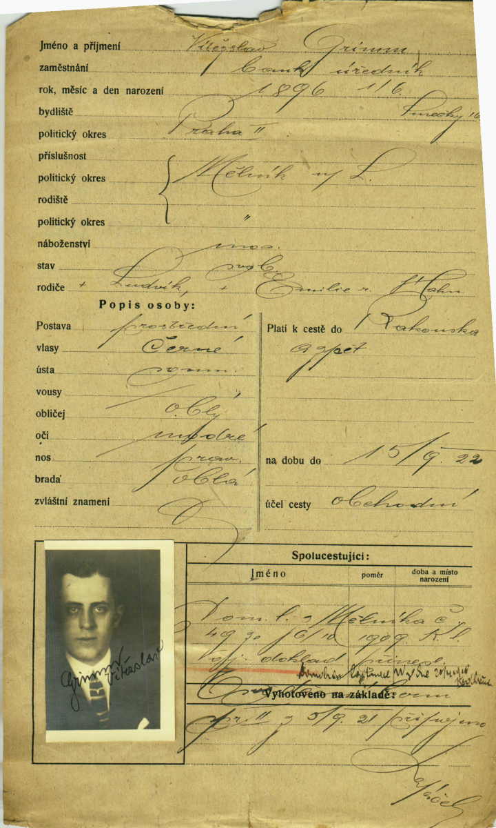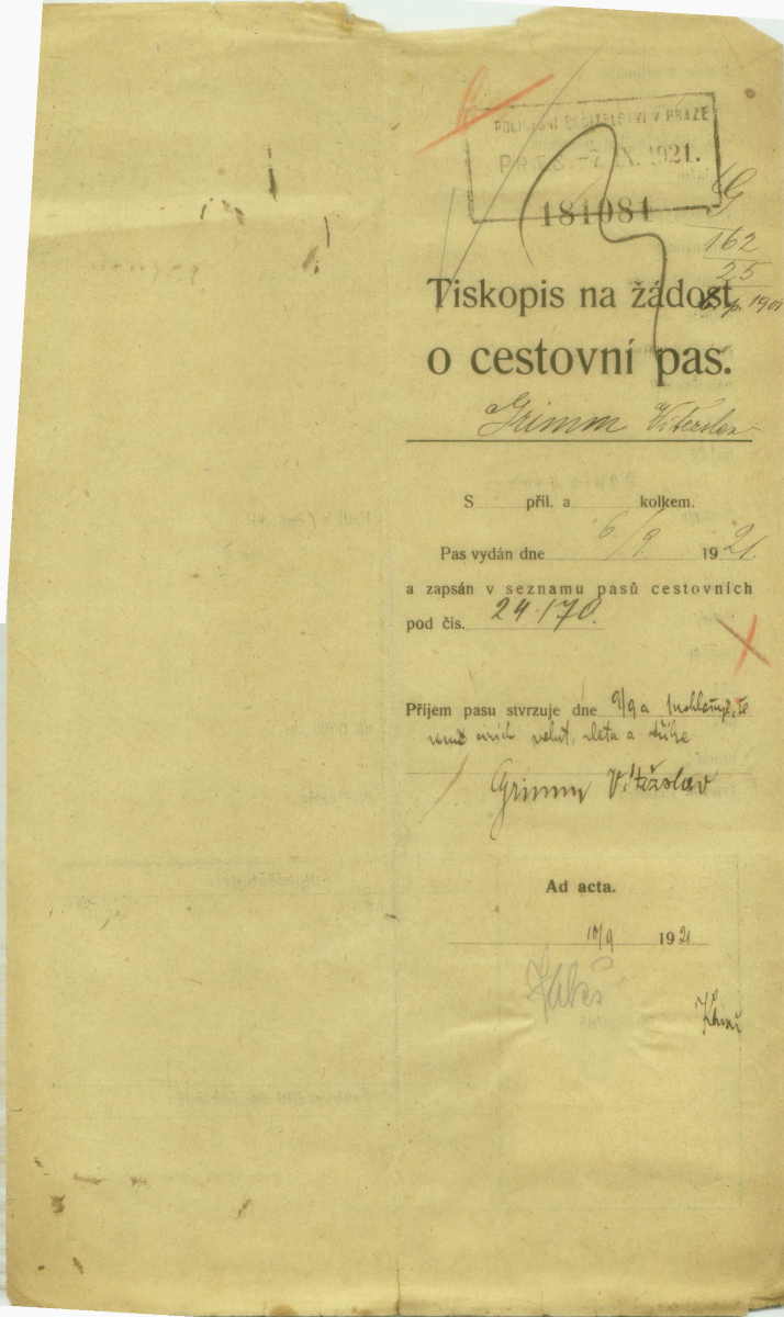 Grimm Vítězslav: Žádost o vydání cestovního pasu