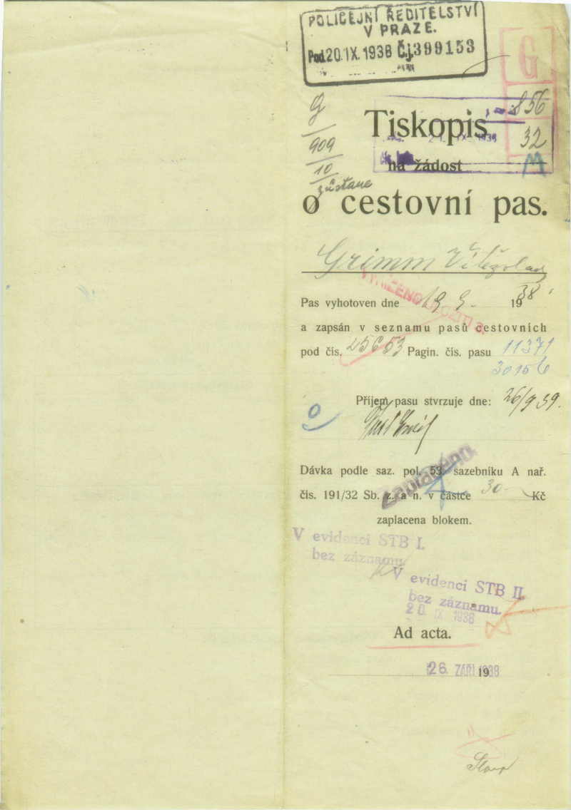 Grimm Vítězslav: Žádost o vydání cestovního pasu