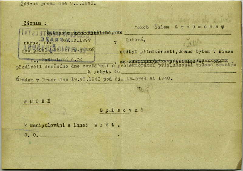 Grossmann Jakob: Potvrzení o předložení osvědčení o státní příslušnosti