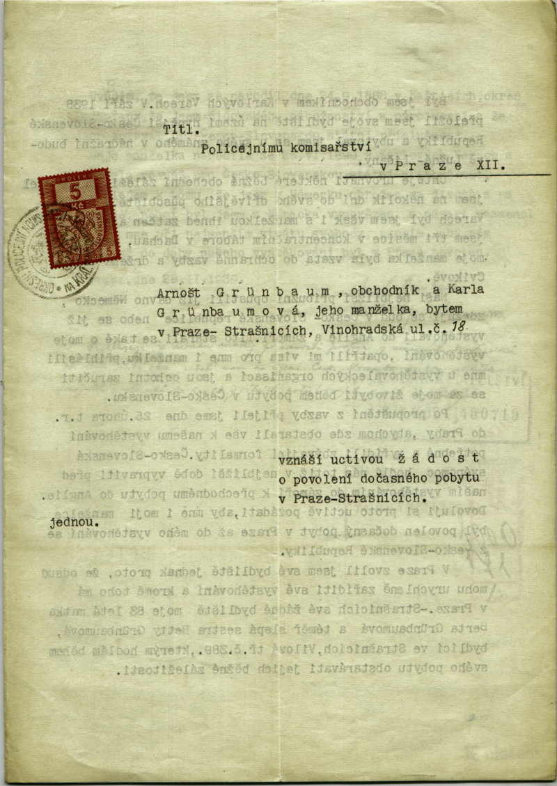 Grünbaum Arnošt: Žádost o povolení pobytu