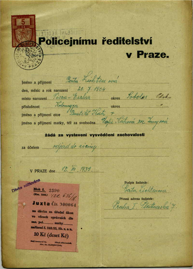 Grünfeldová Berta: Žádost o vystavení vysvědčení zachovalosti