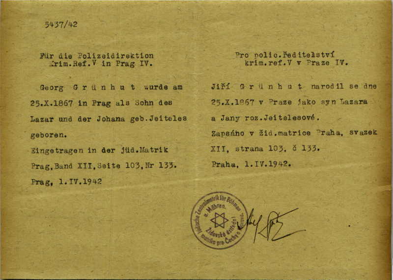 Grünhut Jiří: Výpis z matriky narozených