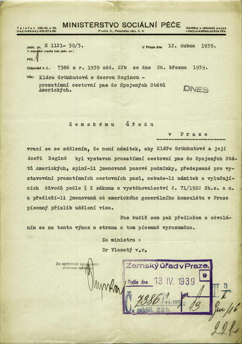 Grünhutová Klára: Vyjádření k žádosti o vydání cestovního pasu