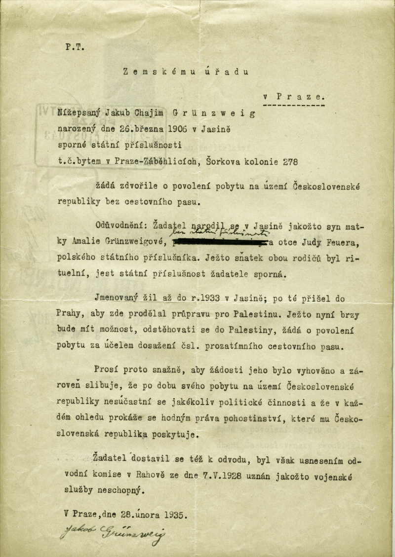 Grünzweig Jakob: Žádost o povolení pobytu bez cestovního pasu