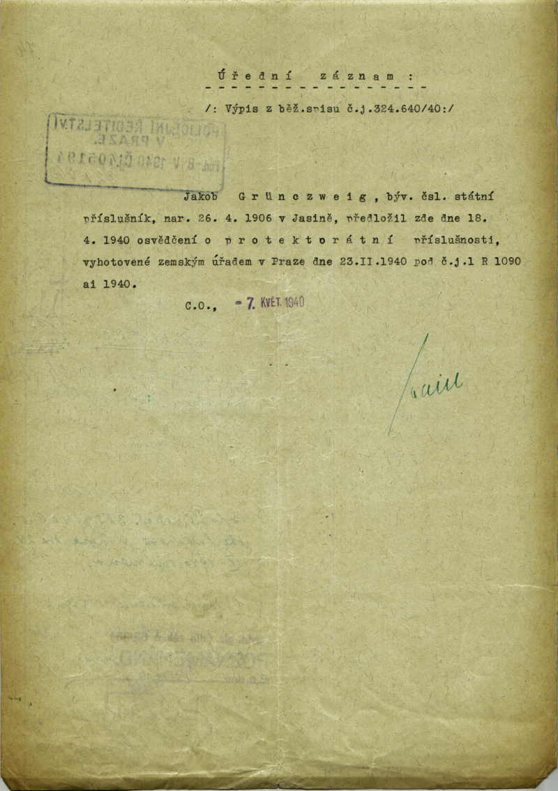 Grünzweig Jakob: Potvrzení o předložení osvědčení o státní příslušnosti