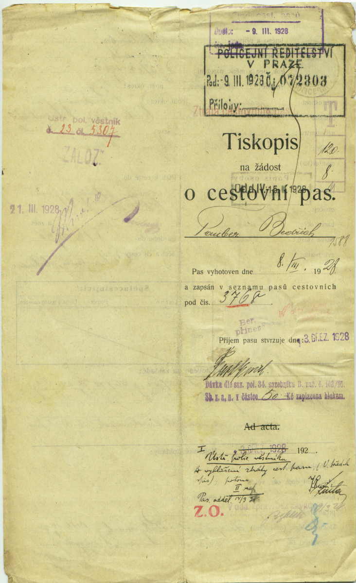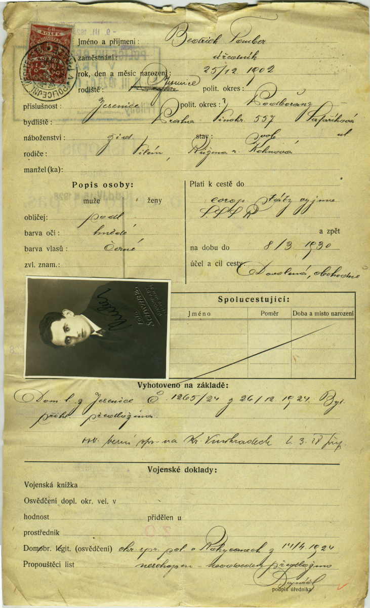 Tauber Bedřich: Žádost o vydání cestovního pasu
