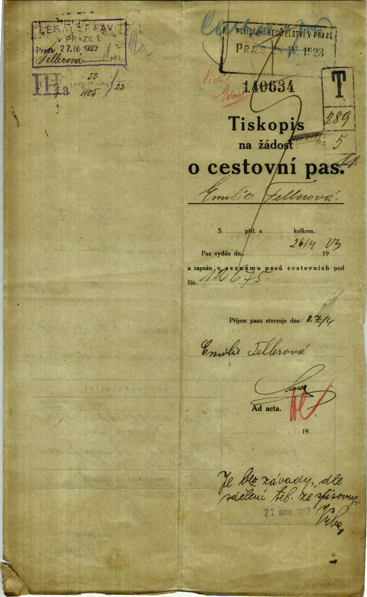 Tellerová Emilie: Žádost o vydání cestovního pasu