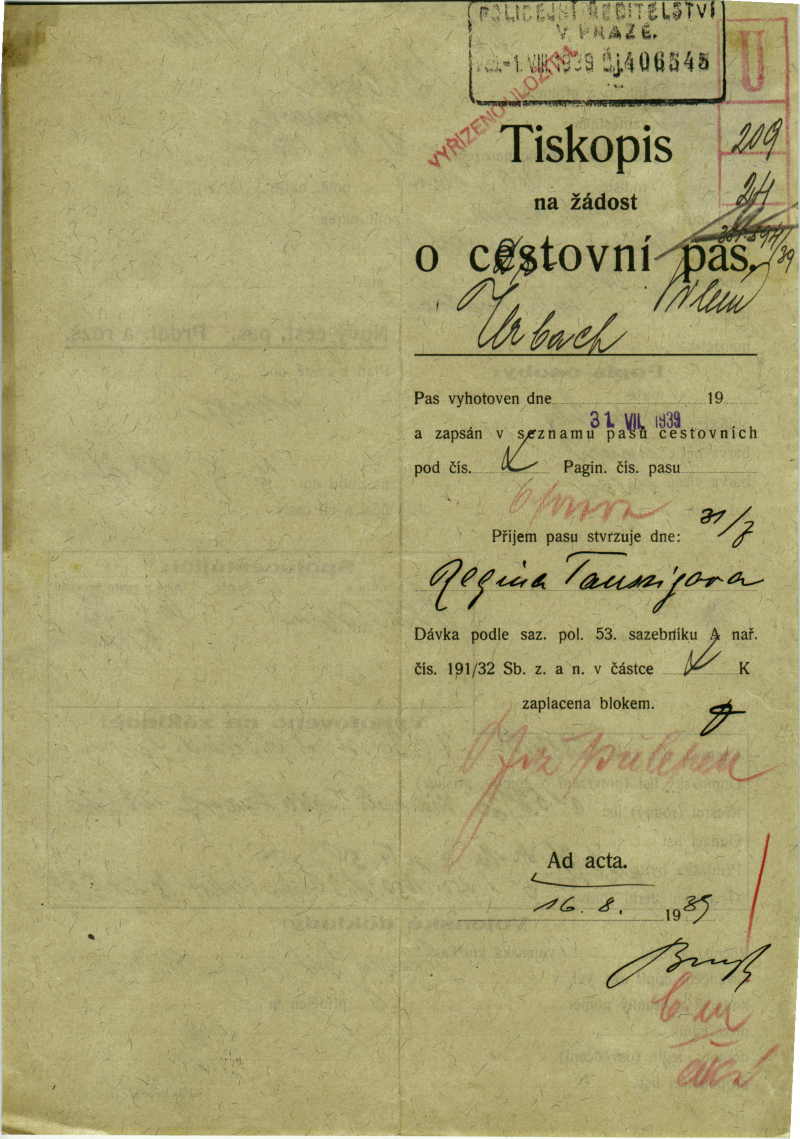 Urbach Vilém: Žádost o vydání cestovního pasu