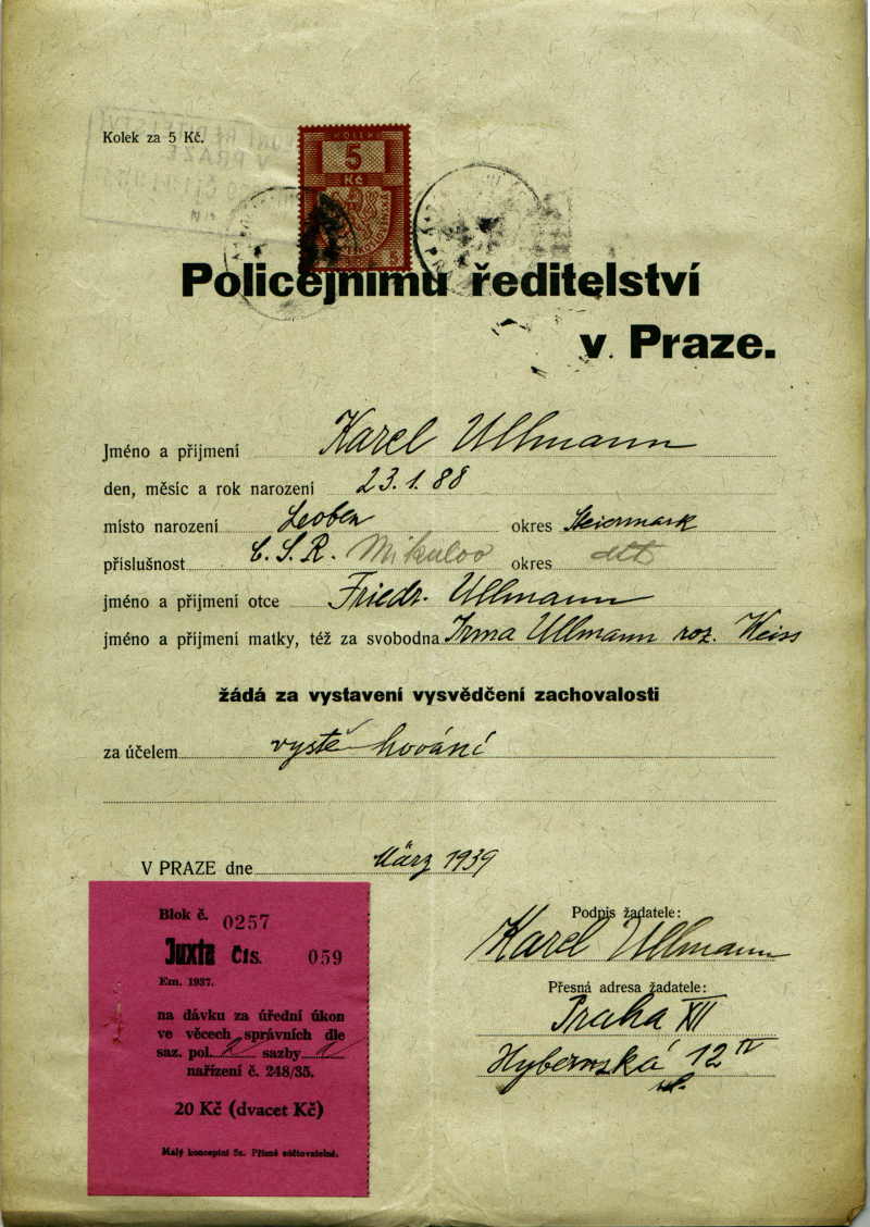 Ullmann Karel: Žádost o vystavení vysvědčení zachovalosti
